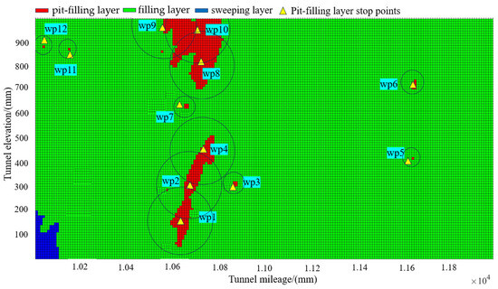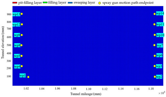 After the patching of the tunnel, the spraying area is reclassified into layers. At this point, the spraying area only consists of the filling layer and the sweeping layer. A grid of stopping points is planned for the filling layer, as shown in Figure 22. The spray gun action sequence for the filling layer is then generated using the PDDL, as shown in Figure 23. Based on the filling action sequence, the filling layer spraying experiment was conducted, as shown in Figure 24. The contour map of the over-excavation and under-excavation values after completing the filling layer spraying is shown in Figure 25. At this point, the maximum over-excavation value is approximately 10 cm.