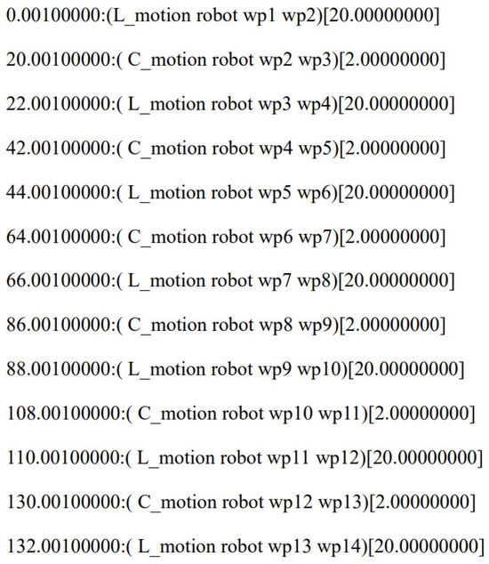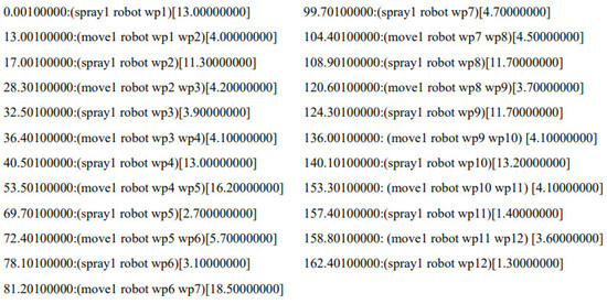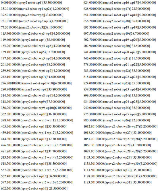 After planning the patching stopping points, the PDDL generates the spray gun action sequence for the patching task. This sequence completes the spraying at all the stopping points. Based on the spraying parameters and the required spraying thickness at each patching stopping point, the stopping time for each point is also planned, as shown in Figure 19.