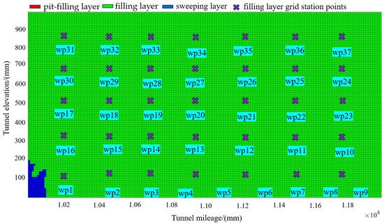 The first operating point of the filling layer is selected at the sidewall positions on both sides of the tunnel, with its coordinates U(X,Y,Z) obtained through vehicle-mounted radar scanning. Using Equations (24)–(26), the coordinates of the first grid station point in the tunnel coordinate system {G} are calculated as V11(X1,Y1,Z1). The positions of the adjacent grid station points are distributed as shown in Figure 8.