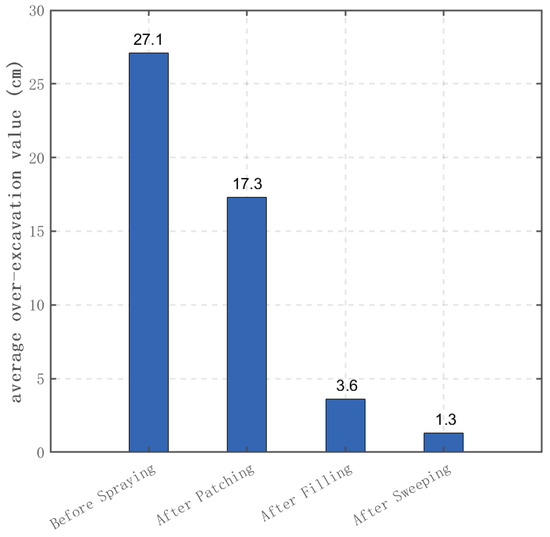 w represents the average over-excavation value, and Ci denotes the over-excavation value in each grid cell. Figure 30 illustrates the relationship between w and the progression of task-layer spraying. As each task layer (patching, filling, and sweeping) is completed, w exhibits a decreasing trend.