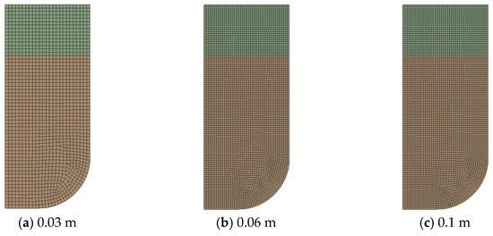 It can be observed from Table 2 that as the mesh size decreases from 0.1 m to 0.06 m, the range of temperature change is small, and the ice phase volume fraction increases from 69.470% to 69.049%, resulting in a change of 0.84%. When the mesh size further decreases from 0.06 m to 0.03 m, the ice phase volume fraction increases from 69.049% to 69.336%, with a change of 0.41%. Therefore, the mesh size has a negligible effect on the calculation results. Considering both the calculation rate and accuracy, this paper employs a structured grid division method to model the evolution of ice shape within the ballast tanks, while utilizing an unstructured grid to depict the evolution of ice shape in the curved section at the bottom of the ballast tank. Figure 5 illustrates the grid models of ballast tanks with varying sizes. Among them, the upper green area is the air domain, and the lower brown area is the ballast water.