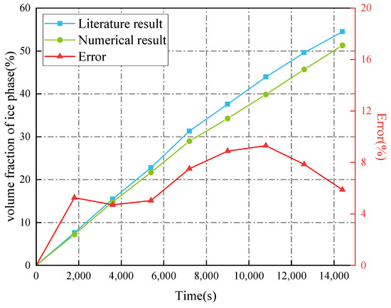 As illustrated in Figure 6, the time-varying curve of the ice phase volume fraction in the ballast tank, obtained through numerical simulation, is compared with data from the literature under identical operating conditions. The trends in the ice phase volume fraction are largely consistent, with an average error of approximately 6.81%. At around 10,800 s, the volume fraction of the ice phase formed by freezing in the literature is approximately 43.95%, while the volume fraction of the ice phase obtained through numerical simulation is about 39.86%. At this point, the error is the largest, with a maximum deviation of approximately 9.31%, which remains below 10%. Therefore, the numerical model of the ballast tank established in this paper is considered reliable.