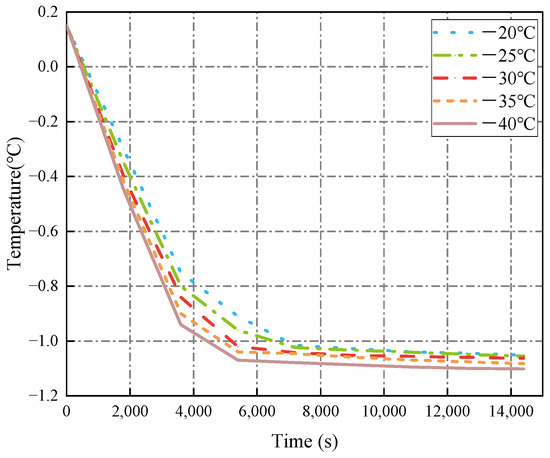 As shown in Figure 8 and Figure 9, the temperature at point a exhibits a stable downward trend under the influence of cold air temperatures. Initially, the temperature at point b decreases rapidly; however, around 4800 s, the rate of decline slows, and the temperature gradually stabilizes. This is because point a is located at the center of the ballast water surface and is greatly affected by the air domain. The heat of the ballast water is lost rapidly, and the cooling rate is relatively fast. While point b is close to the bulkhead and is affected by the seawater temperature, the initial cooling is relatively fast. After the temperature drops to a certain value, the temperature tends to stabilize. When the temperature of the cold air is −40 °C, the temperature of the ballast water is the smallest. The minimum temperature at point a is approximately −1.34 °C, and the minimum temperature at point b is approximately −1.1 °C.