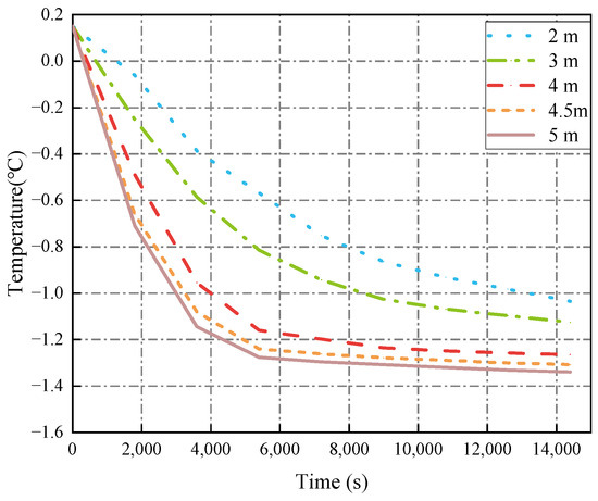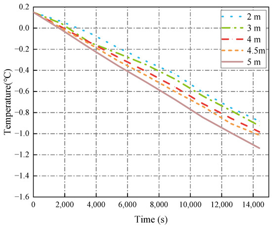Figure 14 and Figure 15 illustrate the correlation between the height of the ballast water level and temperature changes. As the height of the ballast water level decreases, the minimum temperatures at points a and b also decline, albeit to varying degrees, with the overall change being relatively small. When the ballast water level is at 5 m, the volume of the air domain is limited, resulting in a shorter heat transfer time. Consequently, the temperature of the ballast water decreases rapidly, with the minimum temperature at point a reaching −1.14 °C and at point b reaching −1.34 °C. When the ballast water level is reduced to 2 m, the volume of the air domain increases, leading to a longer heat transfer time and a slower decrease in temperature. In this case, the minimum temperature at point a is −0.88 °C, while at point b, it is −1.04 °C.