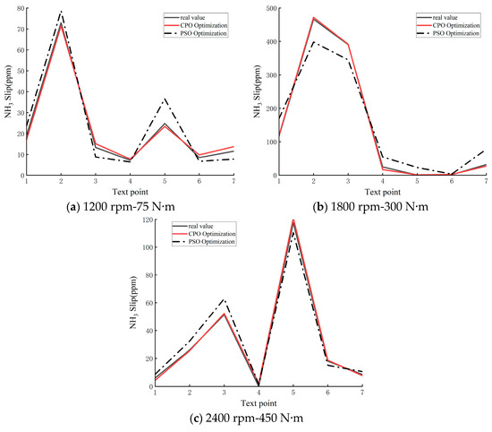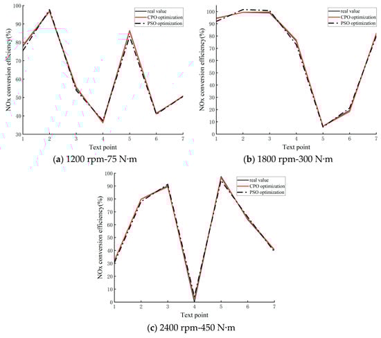 Figure 2 and Figure 3 show the test results with NOx conversion efficiency and NH3 slip as SVM model outputs, respectively. For model accuracy, the coefficient of determination R2 and RMSE were used to assess the model accuracy, as shown in Table 7 and Table 8. For the prediction of NOx conversion efficiency, it can be seen that the CPO optimization algorithm as well as the PSO optimization algorithm are able to make accurate predictions of NOx conversion efficiency under the three operating conditions. The coefficient of determination R2 of the SVM model optimized by the CPO optimization algorithm is above 0.98 and RMSE for the three conditions is 0.76, while the coefficient of determination R2 of the SVM model optimized by the PSO optimization algorithm is about 0.96 and the RMSE for the three conditions is 2.05. It can be seen that the SVM model optimized by the CPO optimization algorithm can predict the NOx conversion efficiency accurately as compared with that of the PSO optimization algorithm; the SVM model has higher prediction accuracy for NOx conversion efficiency.
