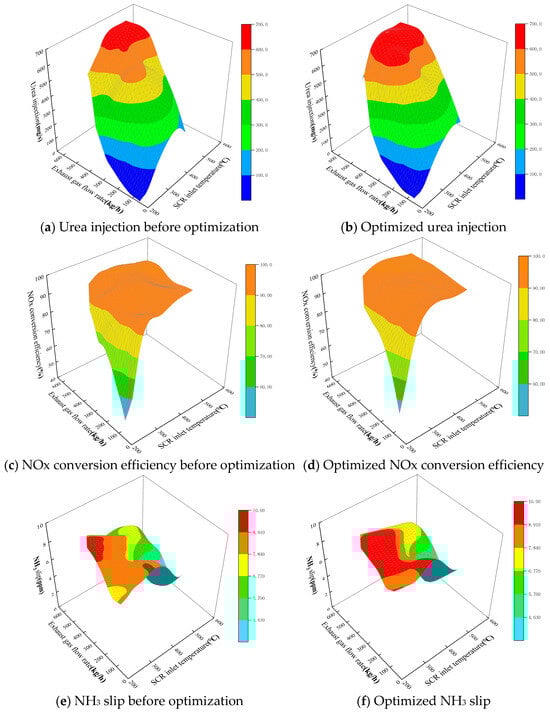 In Figure 5d, it can be seen that after optimization, when the SCR inlet temperature is in the range of 200 °C to 300 °C, the NOx conversion efficiency rises more obviously with the increase in urea injection. When the SCR inlet temperature exceeds 450 °C, the NOx conversion efficiency shows a decreasing trend. This is mainly due to the fact that when the SCR inlet temperature exceeds a certain value (about 450 °C), an oxidation reaction of NH3 occurs through Equation (15). The product of this reaction is NO. Therefore, the increase in temperature leads to a decrease in the NOx conversion efficiency, but the overall remains in a high conversion efficiency range (above 95%).