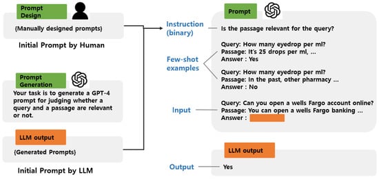 An example prompt for relevance evaluation. It consists of an instruction, few-shot examples, and an input. The initial prompt can be either manually designed by humans or automatically generated by an LLM.