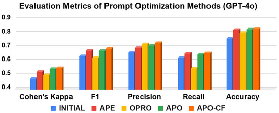 Table 5 and Figure 4 provide a comprehensive comparison of prompt optimization methods across multiple evaluation metrics. The table reports the Cohen’s and F1-score across three LLMs, while the figure focuses on GPT-4o and visualizes performance in terms of , F1-score, precision, recall, and accuracy. Among all methods, APO-CF matches or outperforms existing approaches, demonstrating the effectiveness of our confusion matrix-guided prompt refinement strategy.