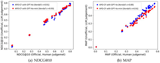 For this evaluation, we use the MS MARCO passage-ranking leaderboard (https://microsoft.github.io/MSMARCO-Passage-Ranking-Submissions/leaderboard/ (accessed on 15 February 2025)), which includes 59 different passage-ranking algorithms registered on the board. By leveraging this dataset, we assess the viability of using LLM-generated relevance labels in large-scale passage-ranking tasks.