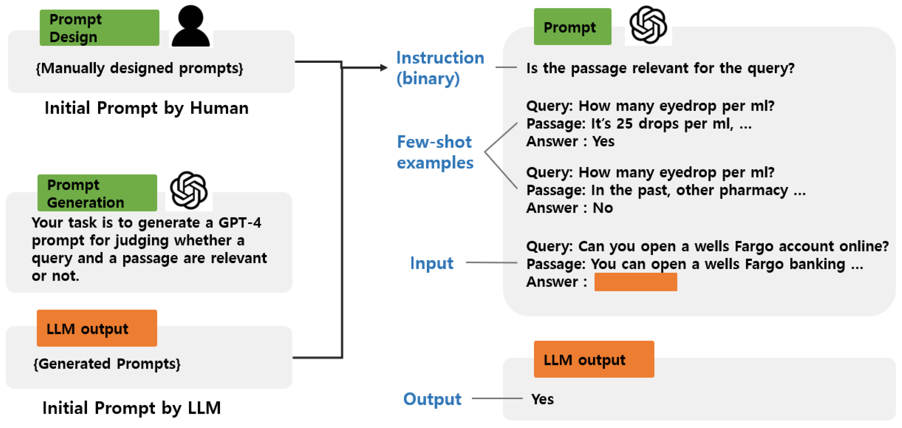 A prompt for evaluating the relevance between a query and a passage generally consists of three components: an instruction, few-shot examples, and an input, as shown in Figure 1. The instruction is the most critical component, as it defines the behavior of the LLM and guides it in generating relevance judgments for the given input. The few-shot examples further clarify the instruction by providing context and demonstrating the expected output format. These examples help the LLM understand the relevance evaluation criteria more effectively. Depending on whether few-shot examples are included, the prompt can follow either a few-shot or zero-shot approach. We conduct experiments using only a zero-shot approach. The input consists of a query and a passage, where the LLM determines whether the passage is relevant to the query. The output is a binary label: “Yes” if the passage is relevant and “No” otherwise.