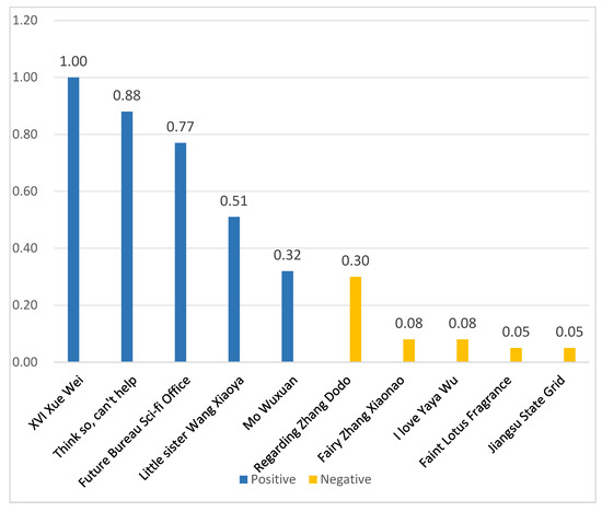 Figure 5 illustrates the top ten Weibo accounts ranked by their overall influence in the dissemination of emotional content related to electromagnetic radiation (EMR). The influence score of each account was computed using a composite index that integrates three dimensions: