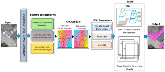 Figure 1 illustrates how the RASST framework incorporates a rotationally aware patch embedding mechanism integrated with a ViT to encode orientation information. The ARC module dynamically aligns convolutional kernels with local object orientations, while the PGL framework refines pseudo-labels using RAW and GC losses. MSFF enhances the model ability to detect objects at varying scales, delivering robust performance across diverse aerial imagery scenarios.
