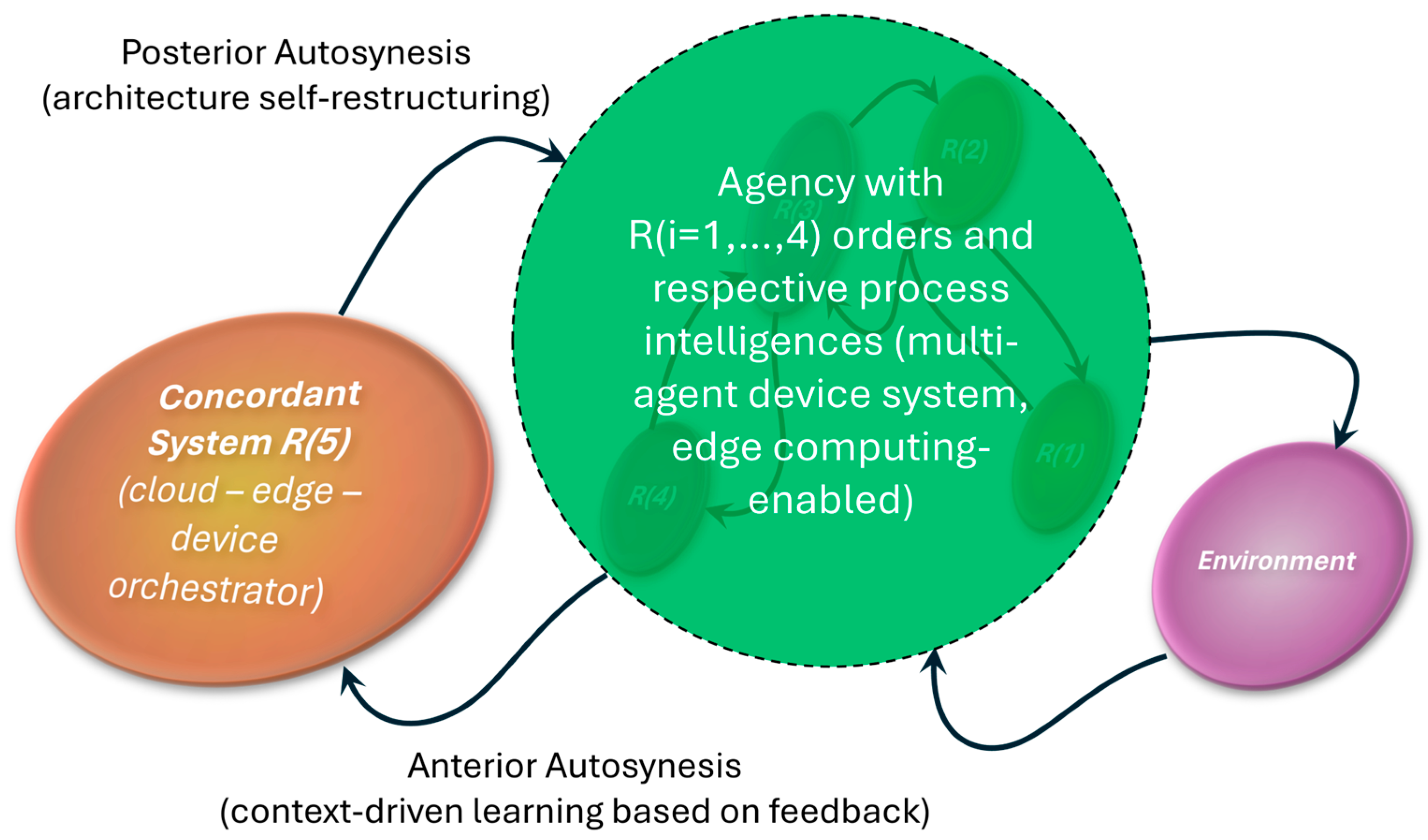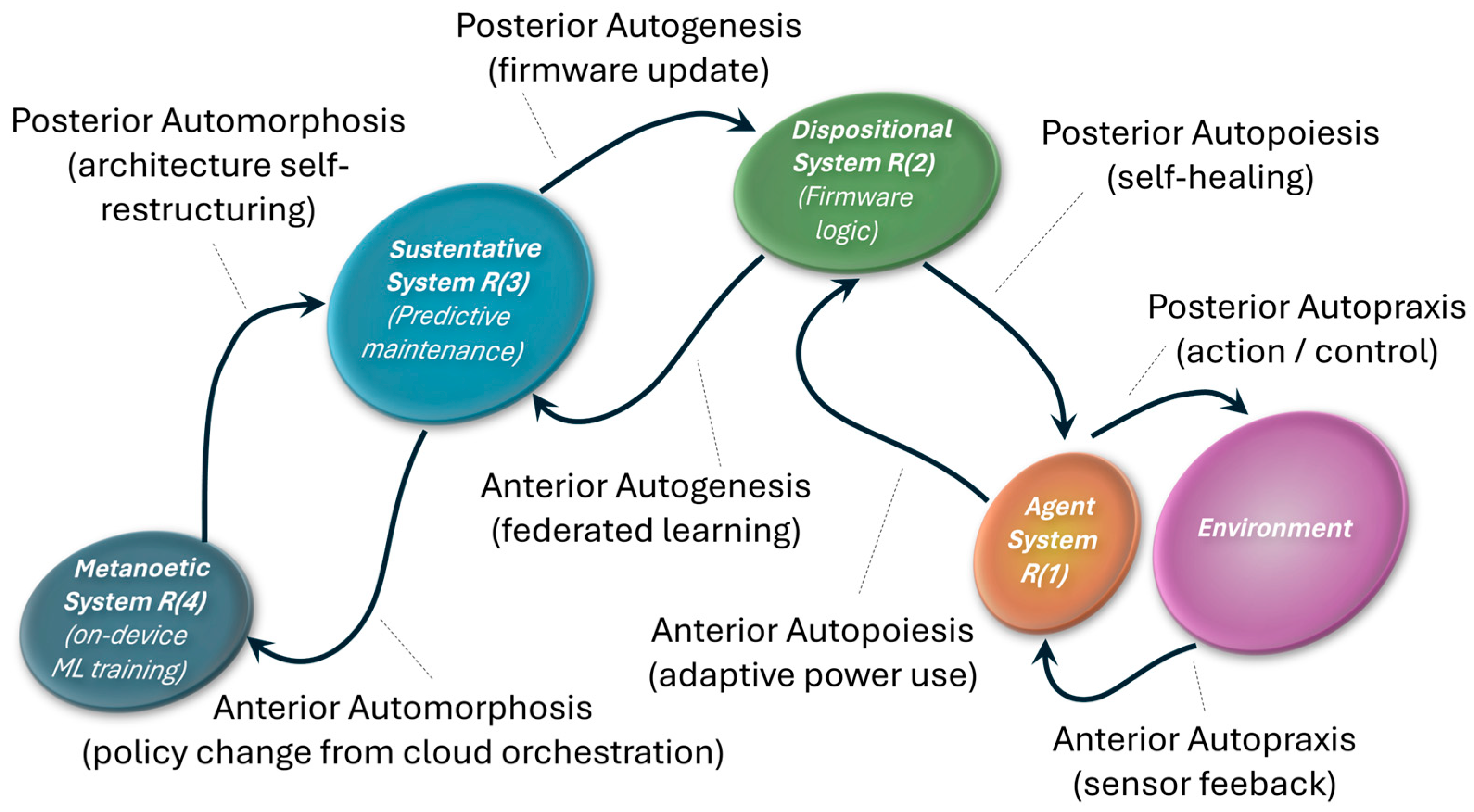 | Autosynesis | Integration of intracellular signaling pathways (mechanical, genetic, biochemical) to create unified cellular decisions. Represents sense-making across molecular subsystems. | Provides system-wide integration of information across referent layers via coherence functions. Acts as the mechanism harmonizing posterior (reactive) and anterior (predictive) process intelligences. | Unifies analytics, device state, and orchestration layers into a coherent decision fabric. Example: cloud–edge–agent alignment enabling system-wide optimization (e.g., digital twins ensuring consensus states across distributed nodes). |