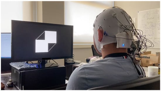 Experimental setup: a participant performing the endogenous attention task while viewing a Necker cube with independently flickering left (6.67 Hz) and right (8.57 Hz) faces. EEG activity is recorded using a 16-channel wireless actiCAP system (Brain Products), with active electrodes placed according to the extended 10–20 system. Central fixation is maintained on a central red dot to minimize ocular artifacts.
