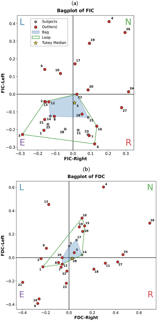 Bagplots visualizing inter-subject variability in attention performance. Right-face versus left-face attention capacity according to (a) FIC and (b) FDC computed via Equations (2) and (3). Each point represents one participant, labeled by subject #. Quadrants reflect perceptual bias: N (normal), L (left-dominant), R (right-dominant), and E (erroneous/incoherent perception). The bag (dark polygon) encloses the 50% most central observations, defined as the convex hull of the deepest points [37]. The fence (dashed loop) inflates the bag by a factor of 3 about the Tukey median; points outside this loop are flagged as potential outliers in a distribution-free, data-depth-based framework. This robust visualization emphasizes multivariate centrality and dispersion, minimizing sensitivity to extreme values.