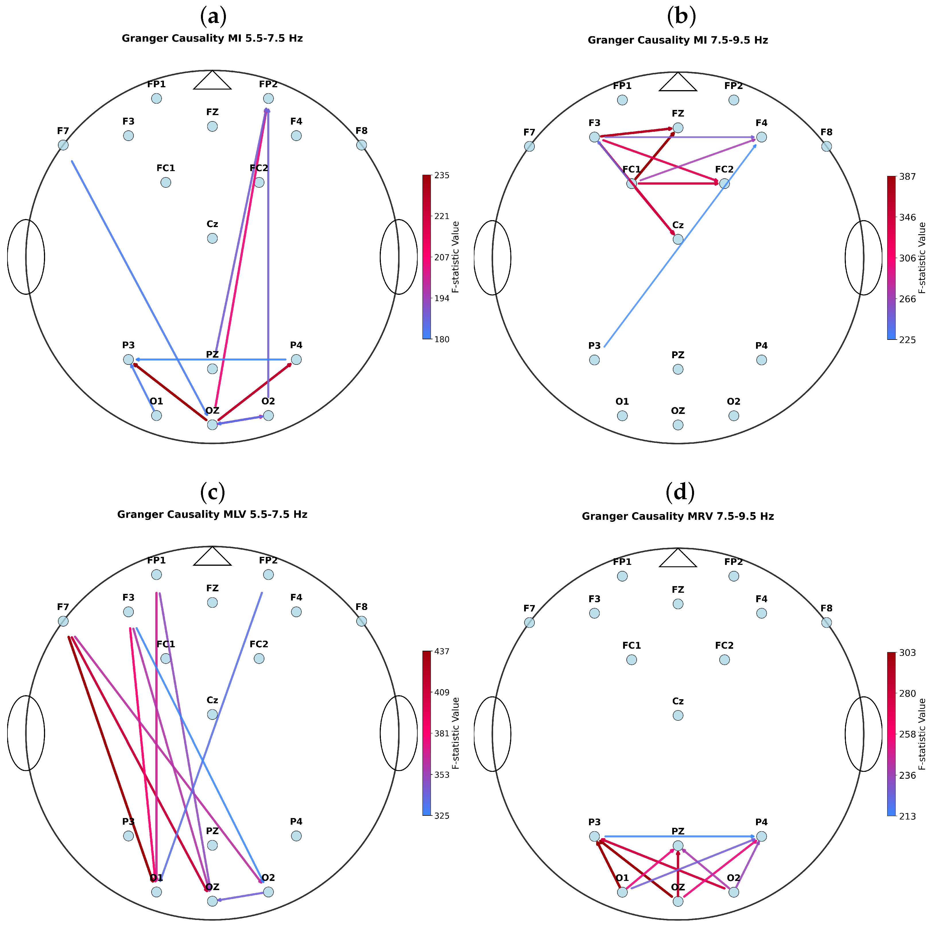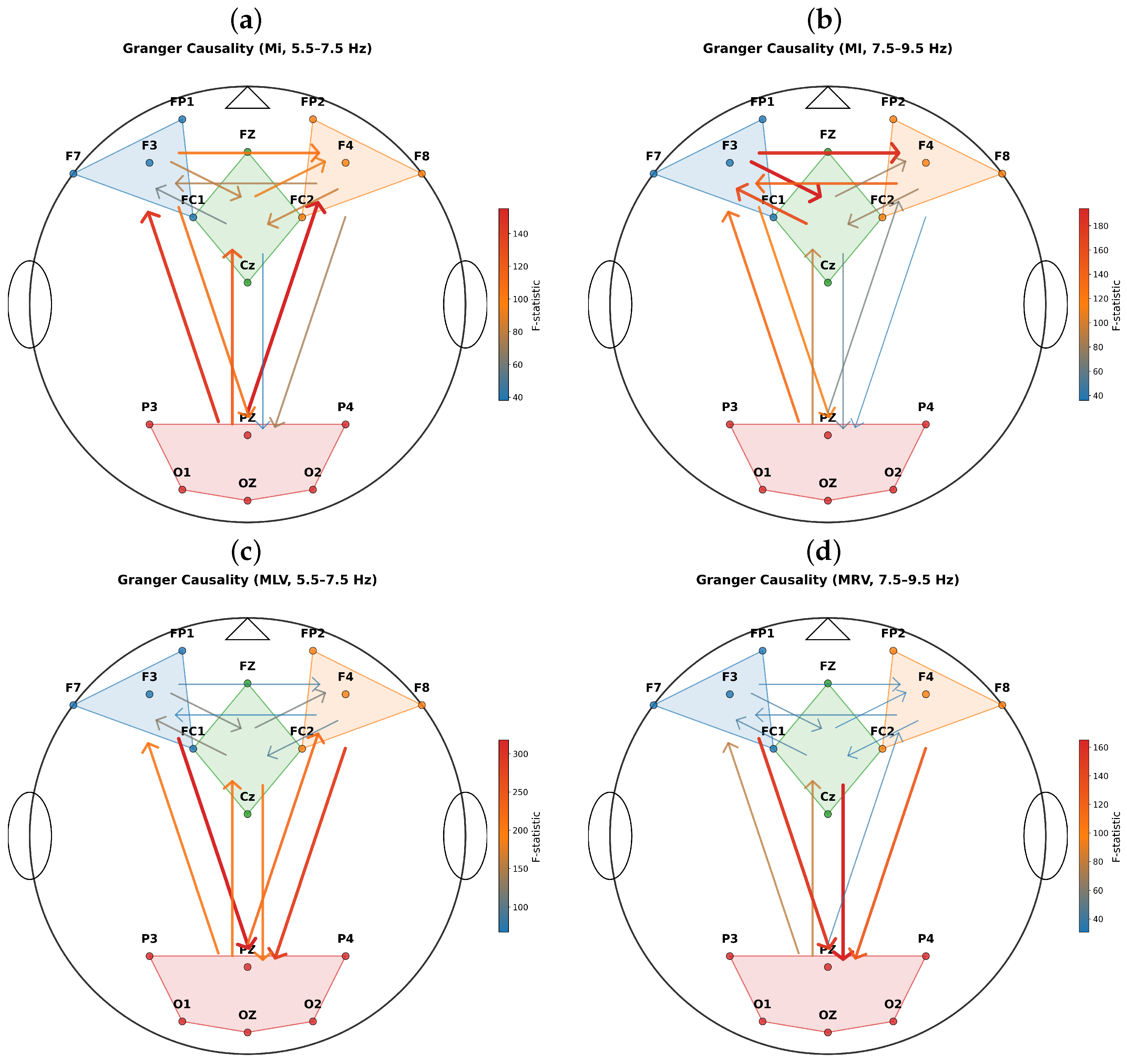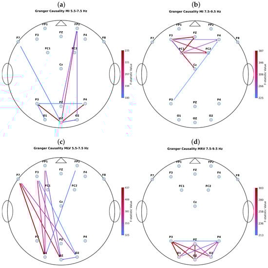 The strongest GC links per task/frequency band were: MI, : Oz → P3 (F = 234.55), MI, : FC1 → Fz (F = 386.57), MLV: F7 → O1 (F = 437.04), and MRV: Oz → P3 (F = 302.60). Notably, during the MLV task, we observed robust bidirectional (forward and feedback) information flow between frontal (F7/F3/FP1) and occipital (O1/Oz/O2) regions, consistent with top-down attentional modulation of visual imagery. In contrast, during the MRV task, while strong intra-occipito-parietal coupling was present, the dominant directional links did not involve frontal areas; instead, the strongest connections were confined within posterior cortices, suggesting a more bottom-up or perceptually anchored processing mode.