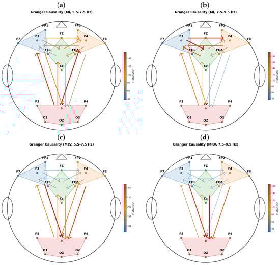 Figure 6 reveals a frequency- and task-dependent reconfiguration of large-scale effective connectivity. Notably, in the band, the MLV task (Figure 6c) exhibits markedly enhanced effective connectivity from frontal to occipito-parietal regions compared to MI (Figure 6a), whereas the MRV task (Figure 6d) shows attenuated bidirectional coupling relative to MI in the band (Figure 6b). Critically, the dominant causal direction shifts across tasks: during MI (involuntary attention), top-down influences from occipito-parietal to frontal regions prevail (Figure 6a,b), consistent with stimulus-driven attentional orienting [47]. In contrast, during MLV/MRV (endogenous attention task), a reversal occurs, the causality from frontal to occipito-parietal area dominates (Figure 6c,d), suggesting active top-down control of visual perception [49].