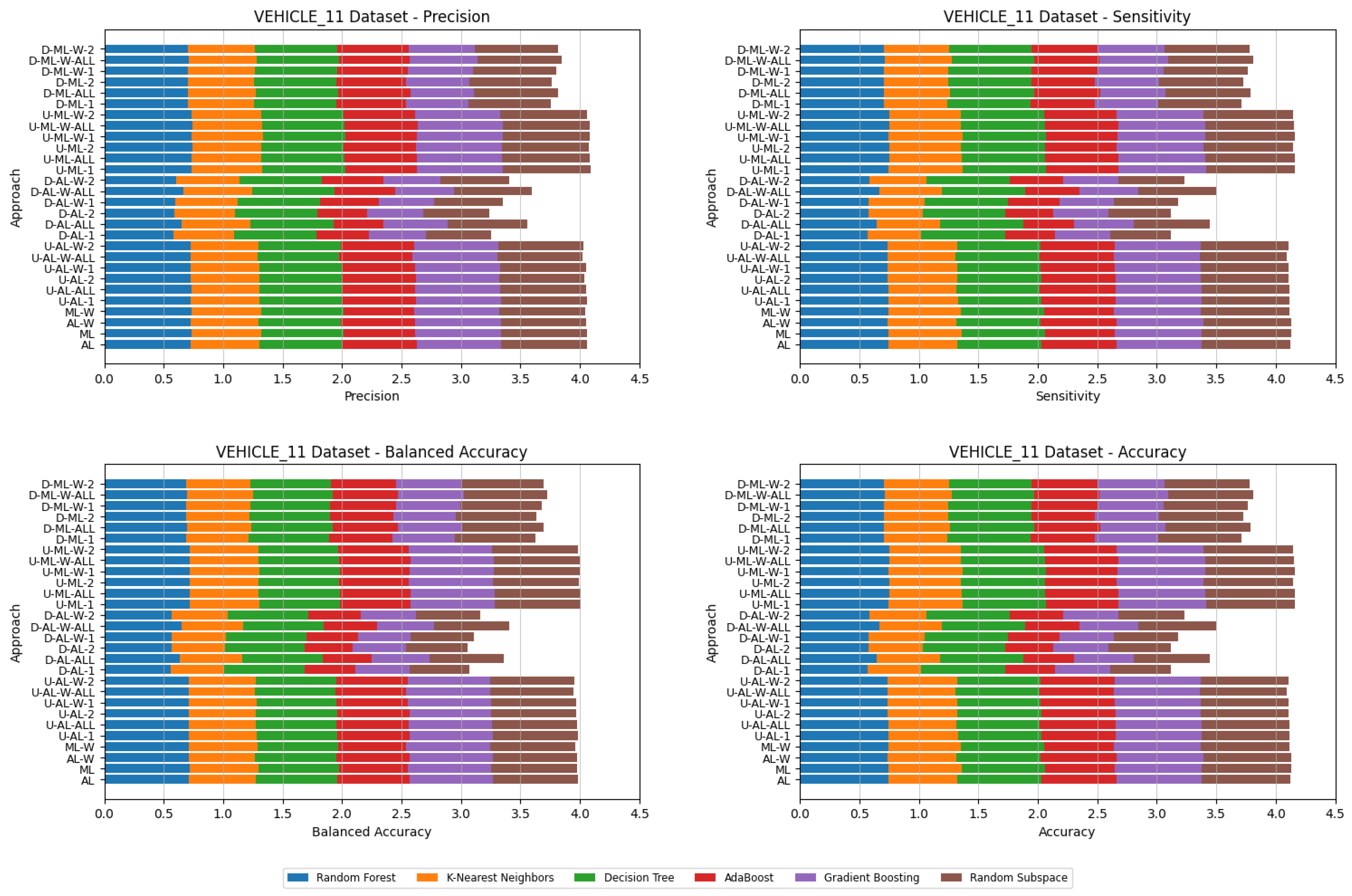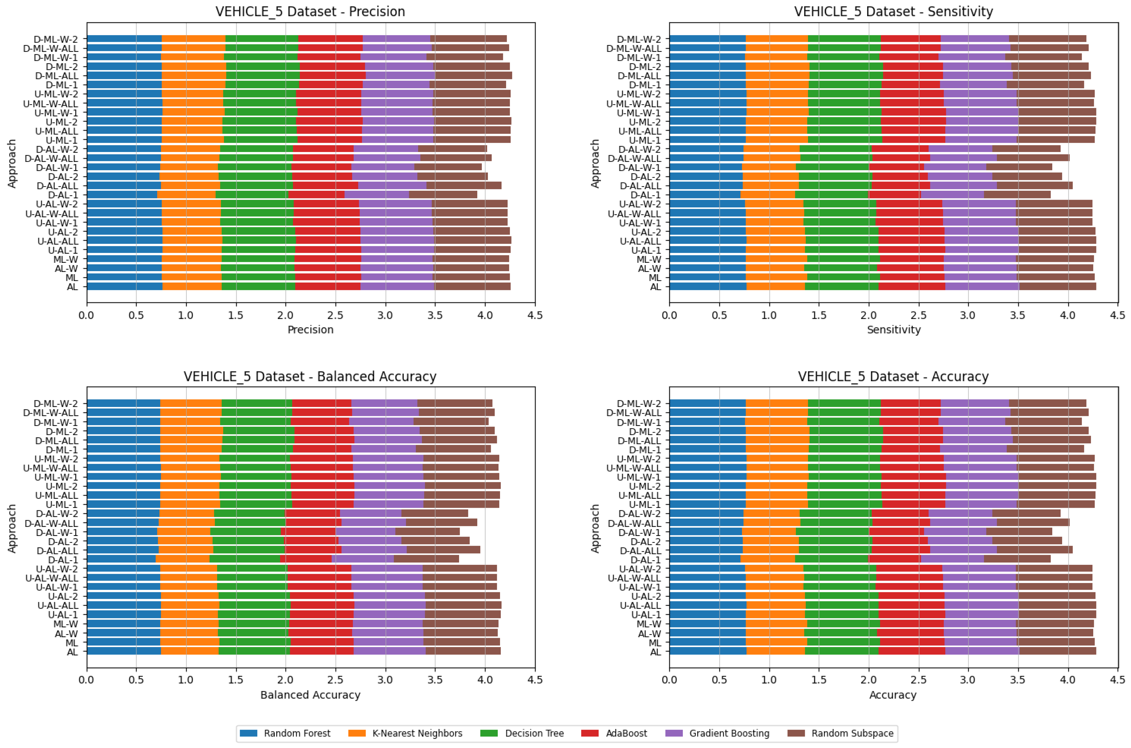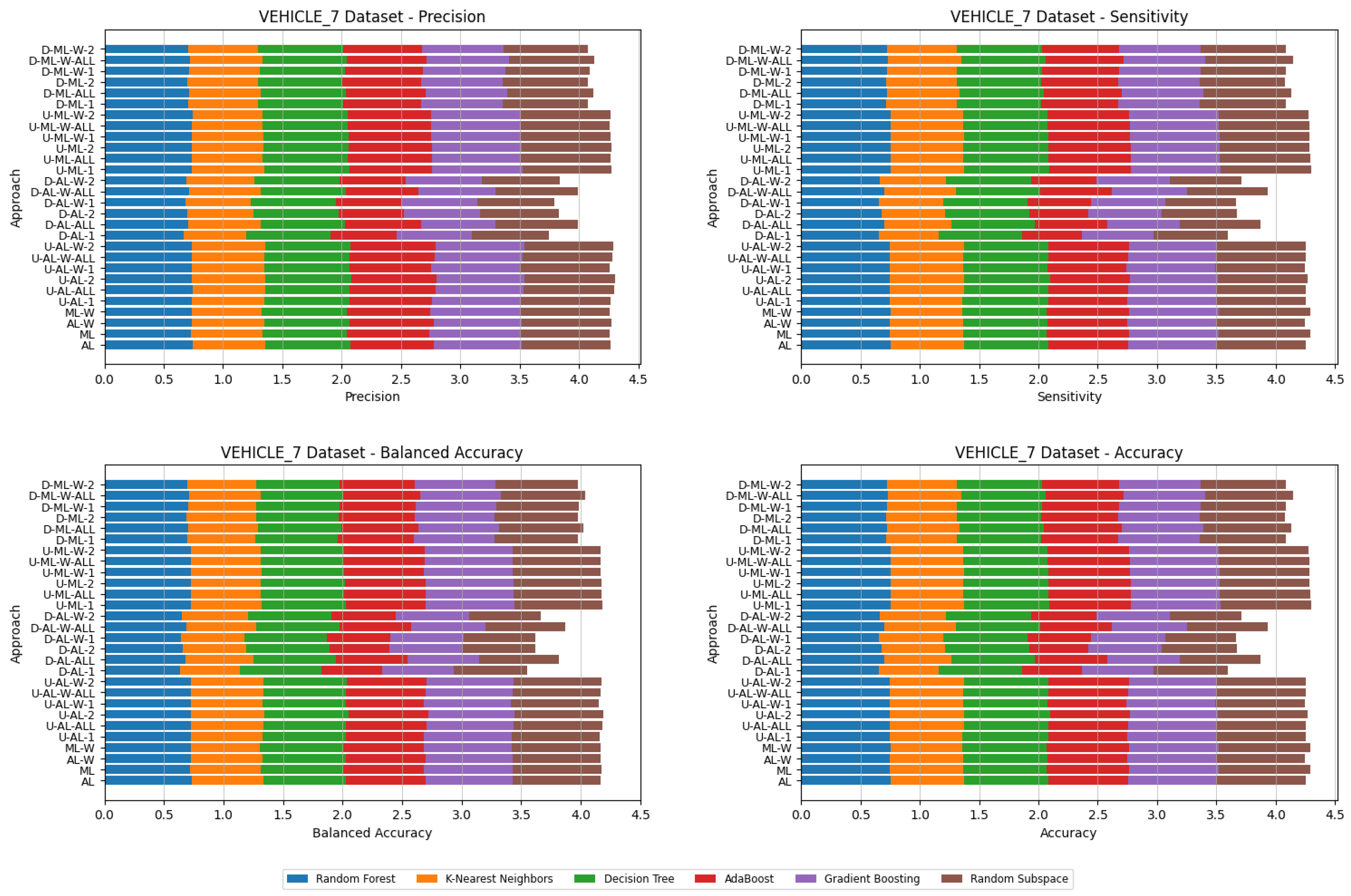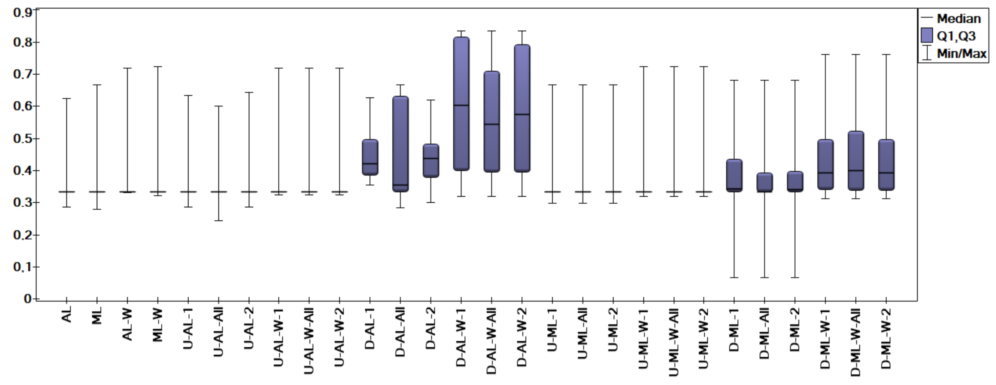 - D-AL-W-2—similar to D-AL-2 but, when summing prediction vectors, weights proportional to the quality of the local model are used.All the above approaches were also used in combination with prediction vectors from the measurement level. Thus, we obtained approaches ML, ML-W, U-ML-1, U-ML-All, U-ML-2, U-ML-W-1, U-ML-W-All, U-ML-W-2, D-ML-1, D-ML-All, D-ML-2, D-ML-W-1, D-ML-W-All, and D-ML-W-2.
