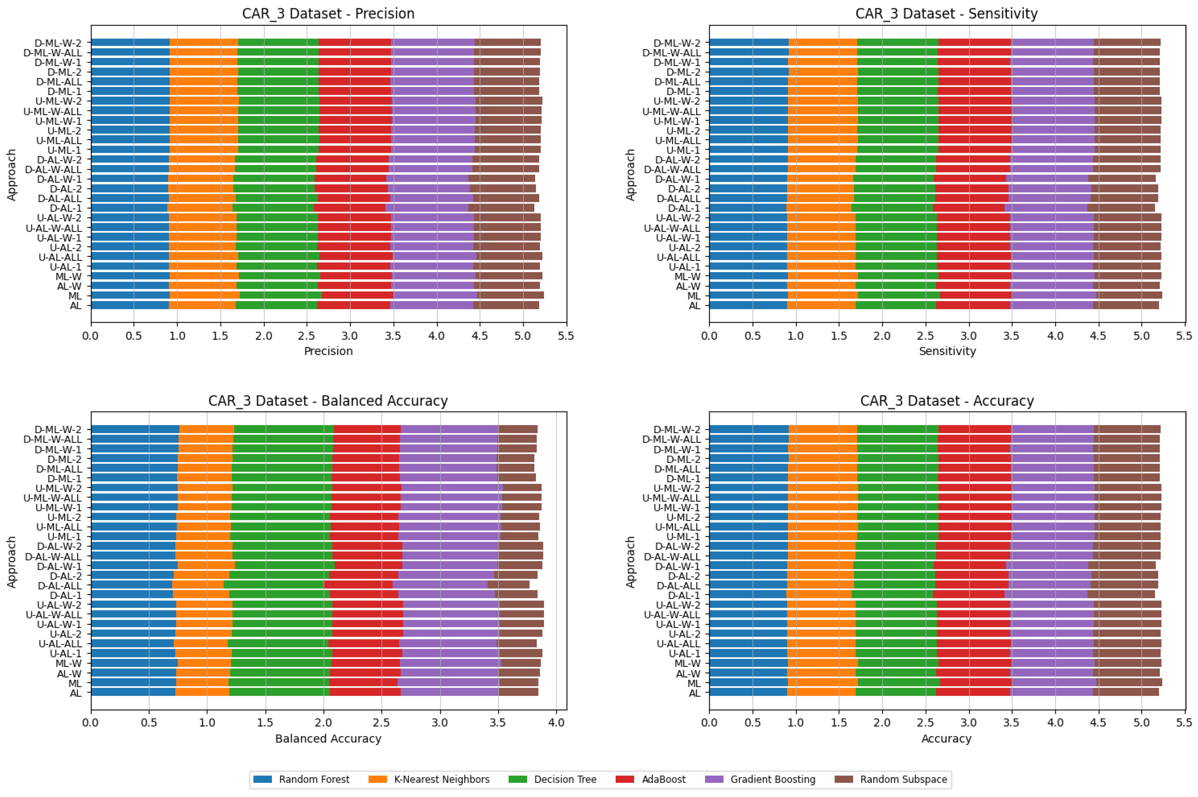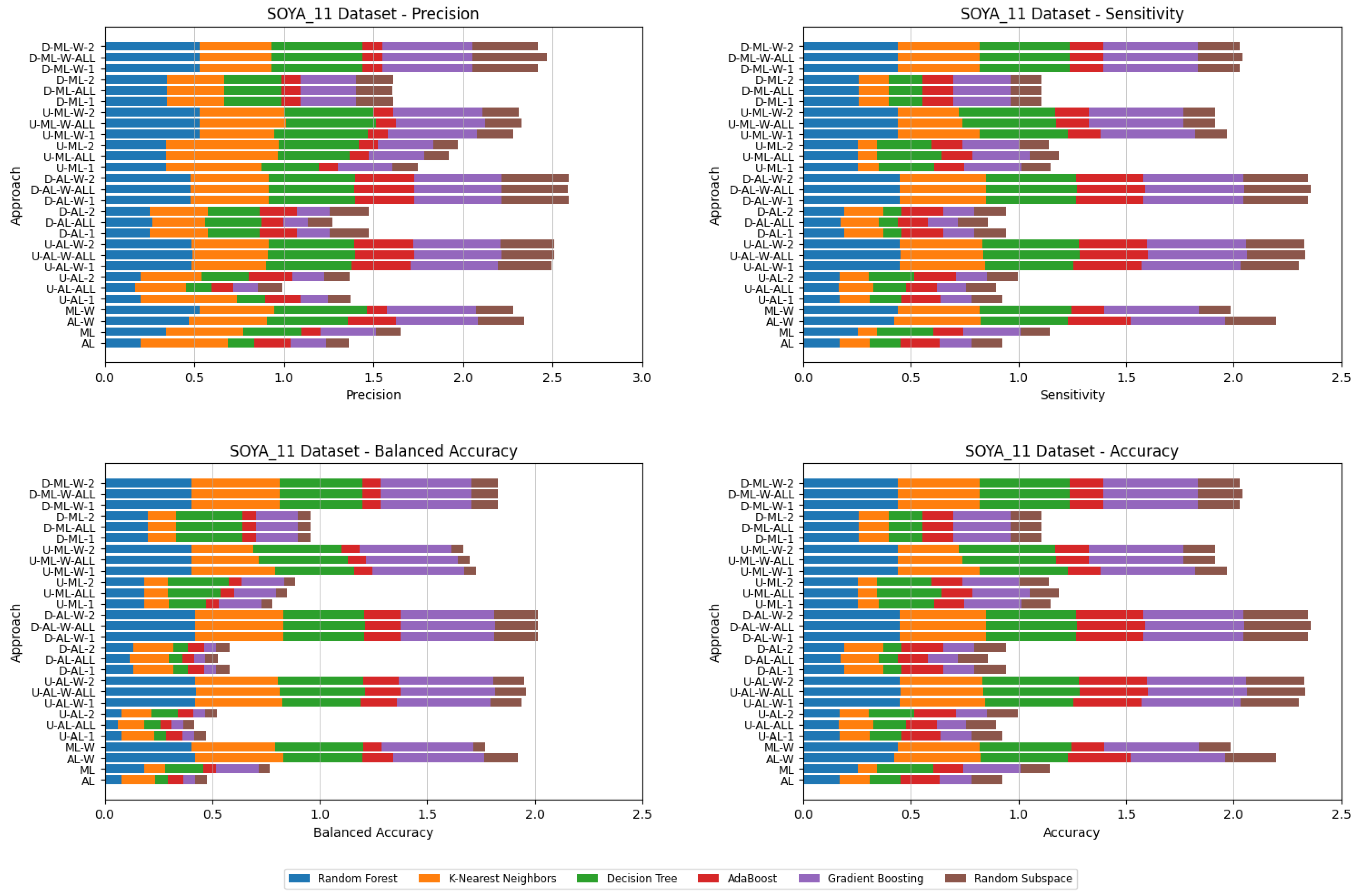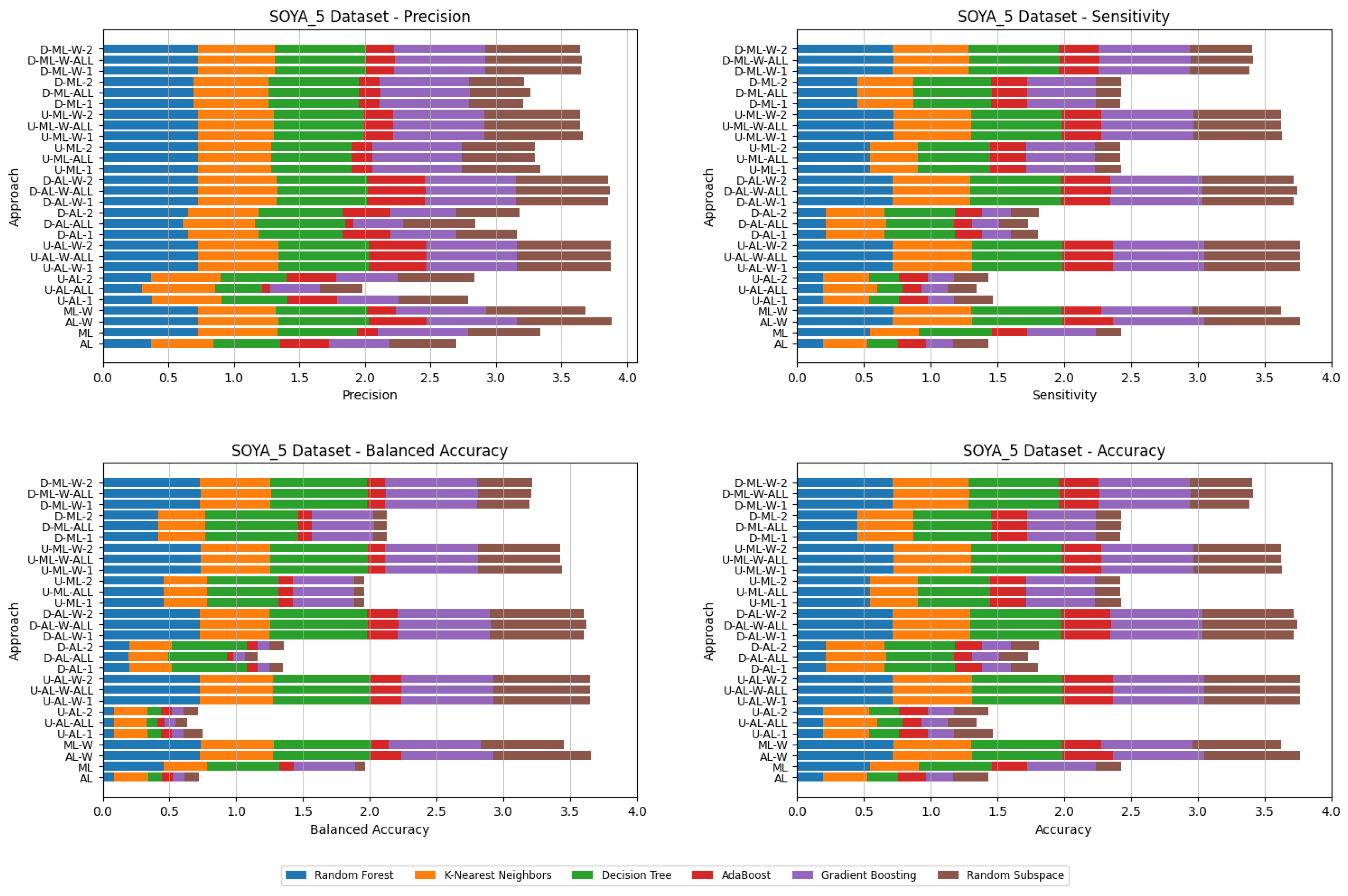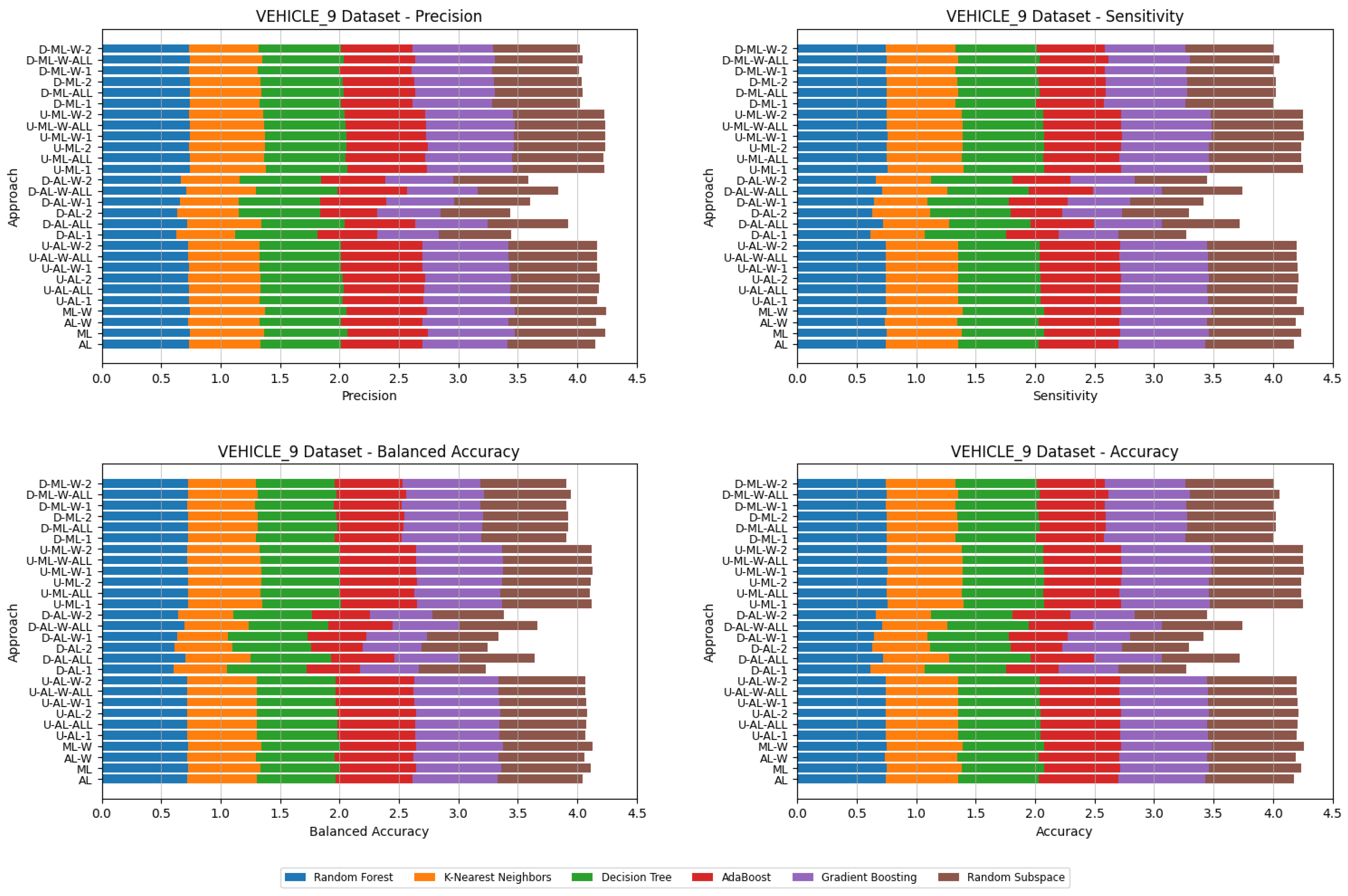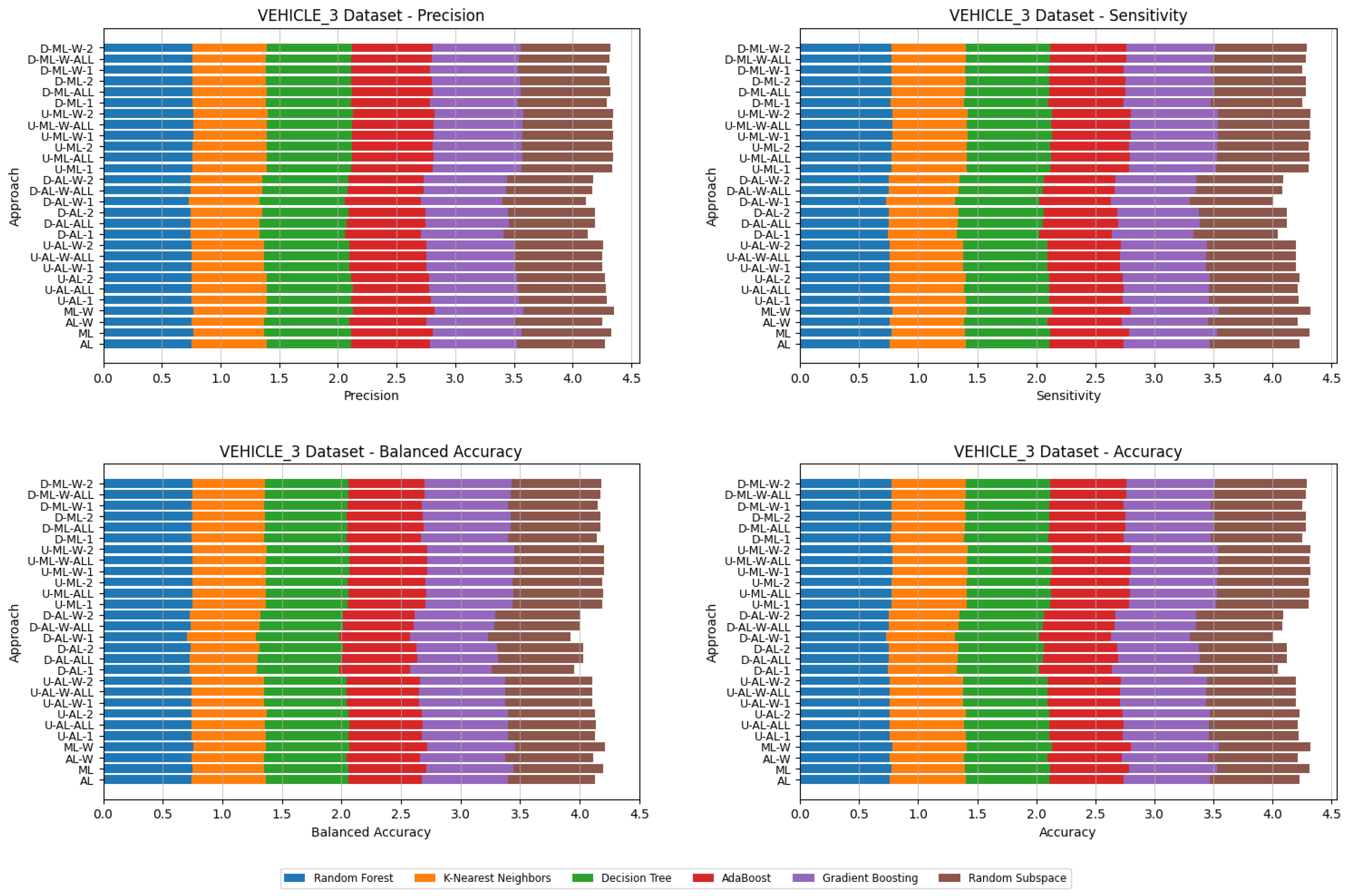 - D-AL-W-2—similar to D-AL-2 but, when summing prediction vectors, weights proportional to the quality of the local model are used.All the above approaches were also used in combination with prediction vectors from the measurement level. Thus, we obtained approaches ML, ML-W, U-ML-1, U-ML-All, U-ML-2, U-ML-W-1, U-ML-W-All, U-ML-W-2, D-ML-1, D-ML-All, D-ML-2, D-ML-W-1, D-ML-W-All, and D-ML-W-2.