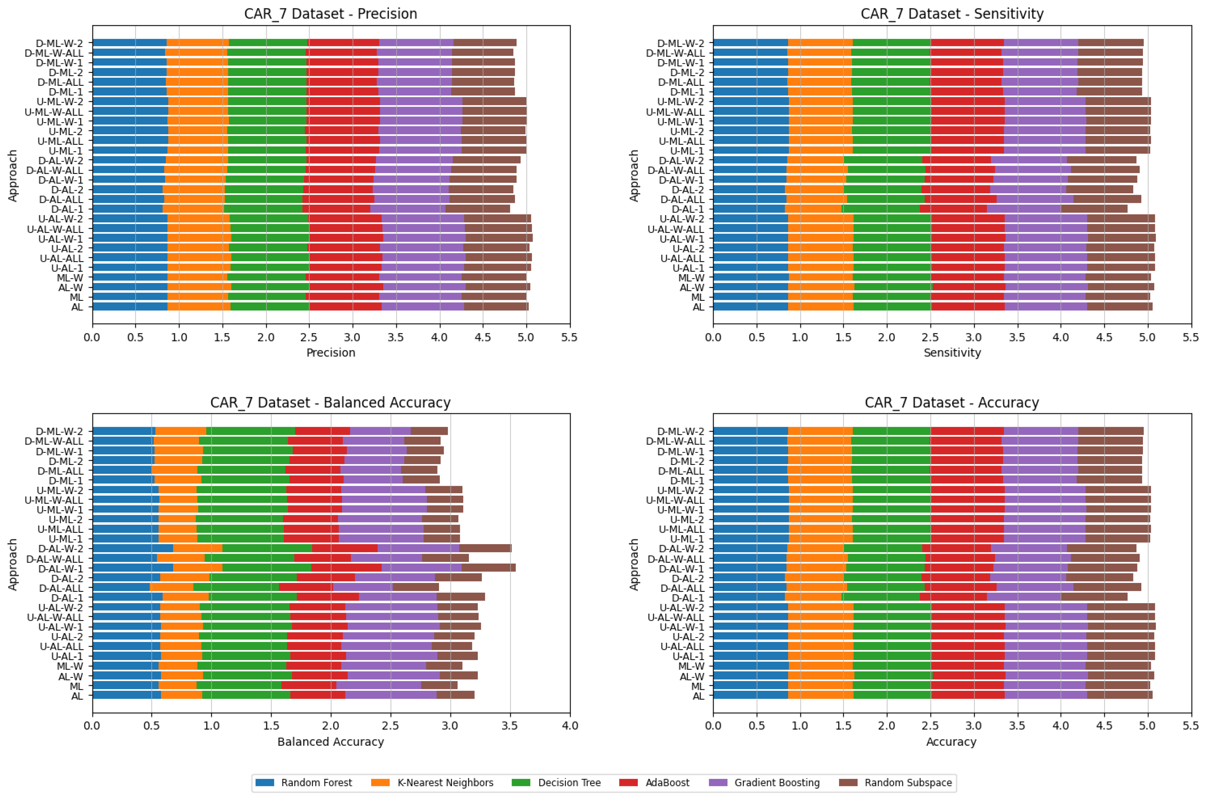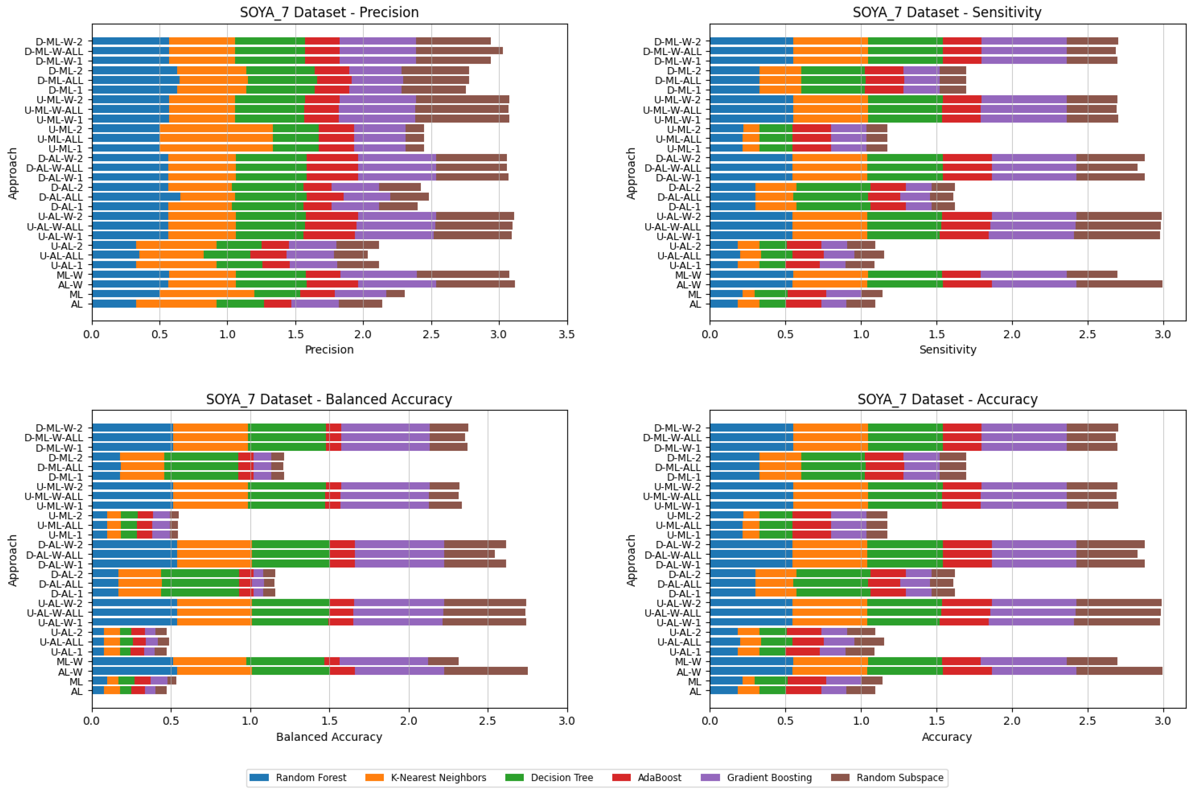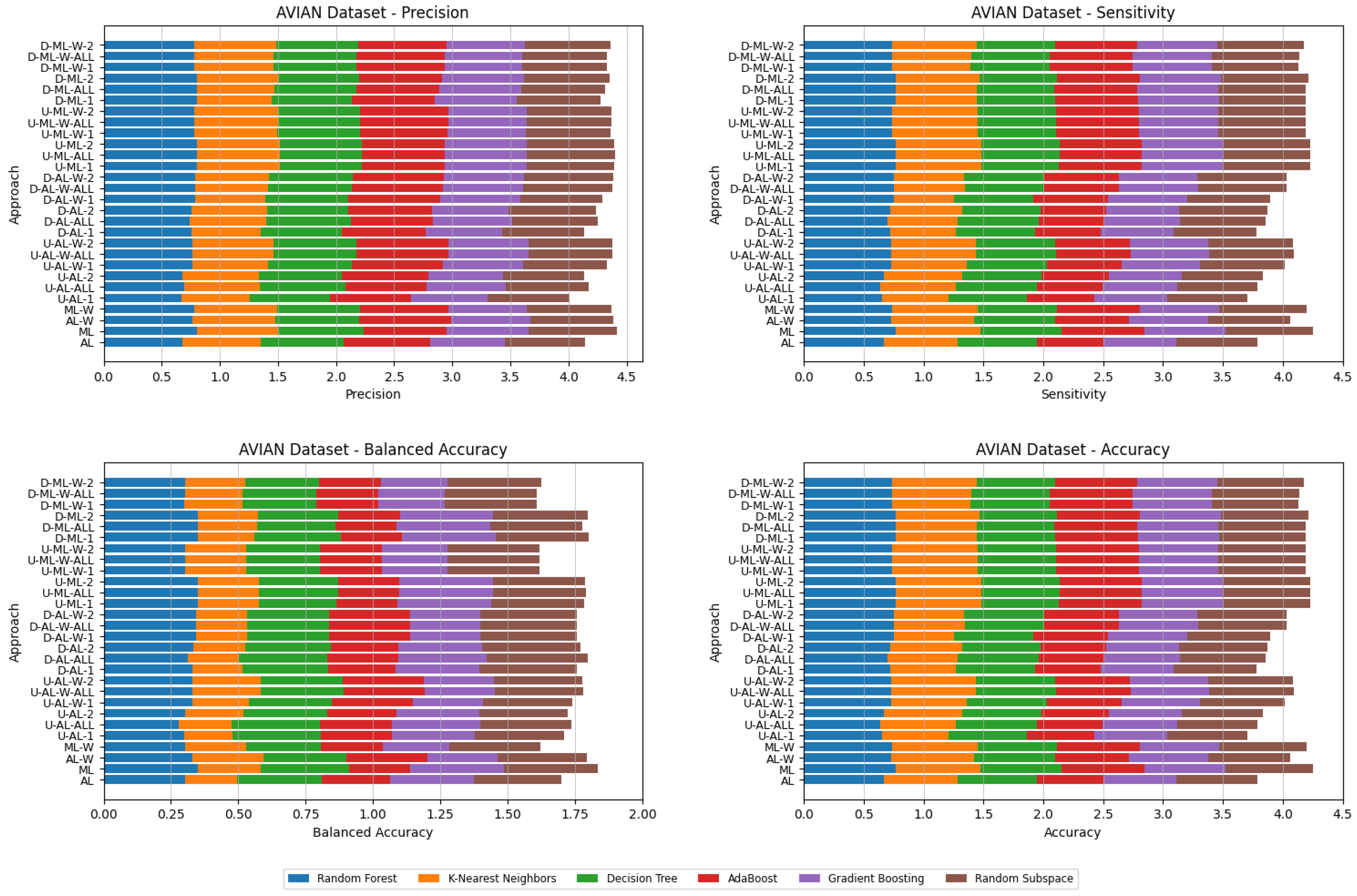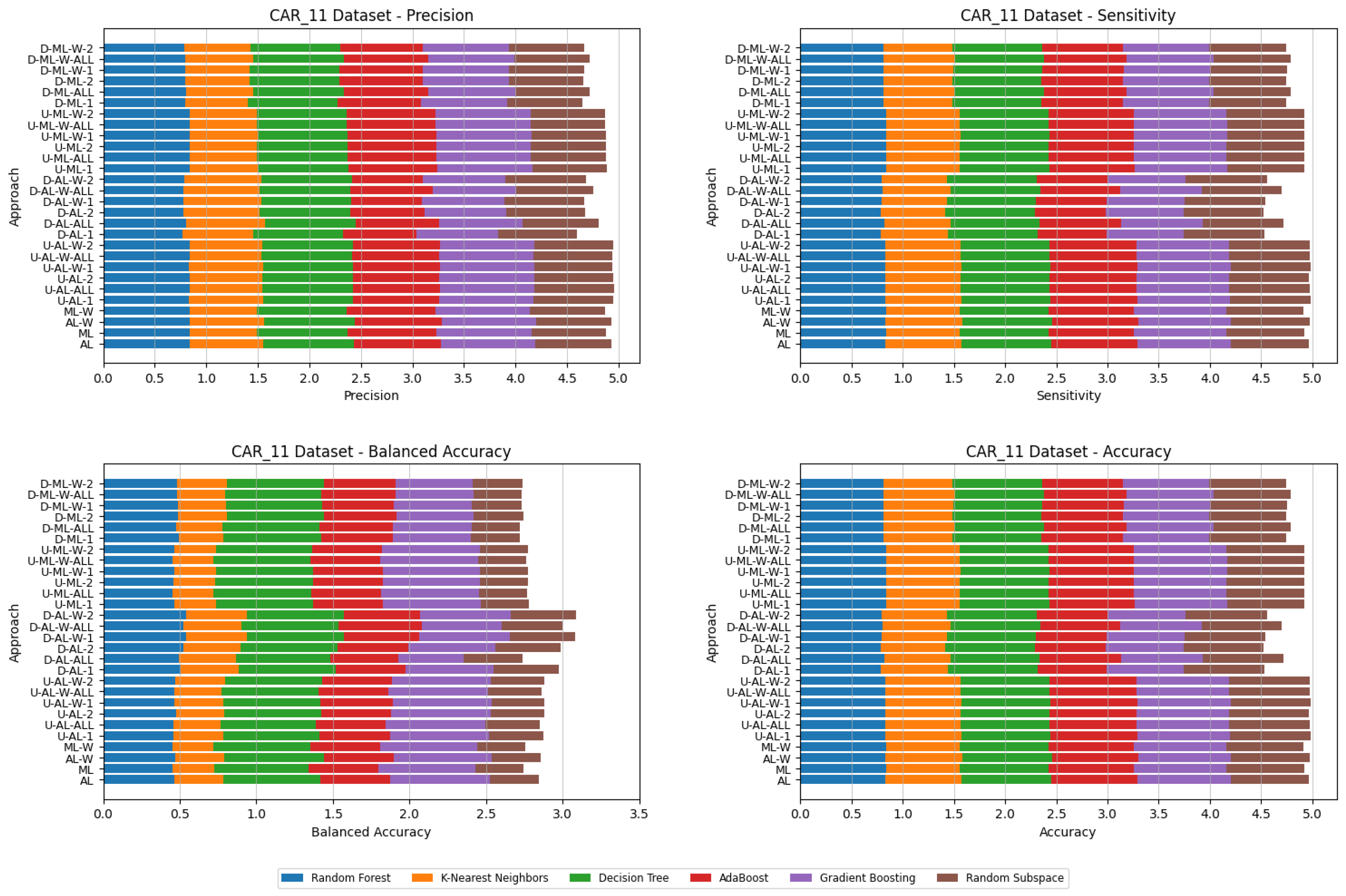 - D-AL-W-2—similar to D-AL-2 but, when summing prediction vectors, weights proportional to the quality of the local model are used.All the above approaches were also used in combination with prediction vectors from the measurement level. Thus, we obtained approaches ML, ML-W, U-ML-1, U-ML-All, U-ML-2, U-ML-W-1, U-ML-W-All, U-ML-W-2, D-ML-1, D-ML-All, D-ML-2, D-ML-W-1, D-ML-W-All, and D-ML-W-2.