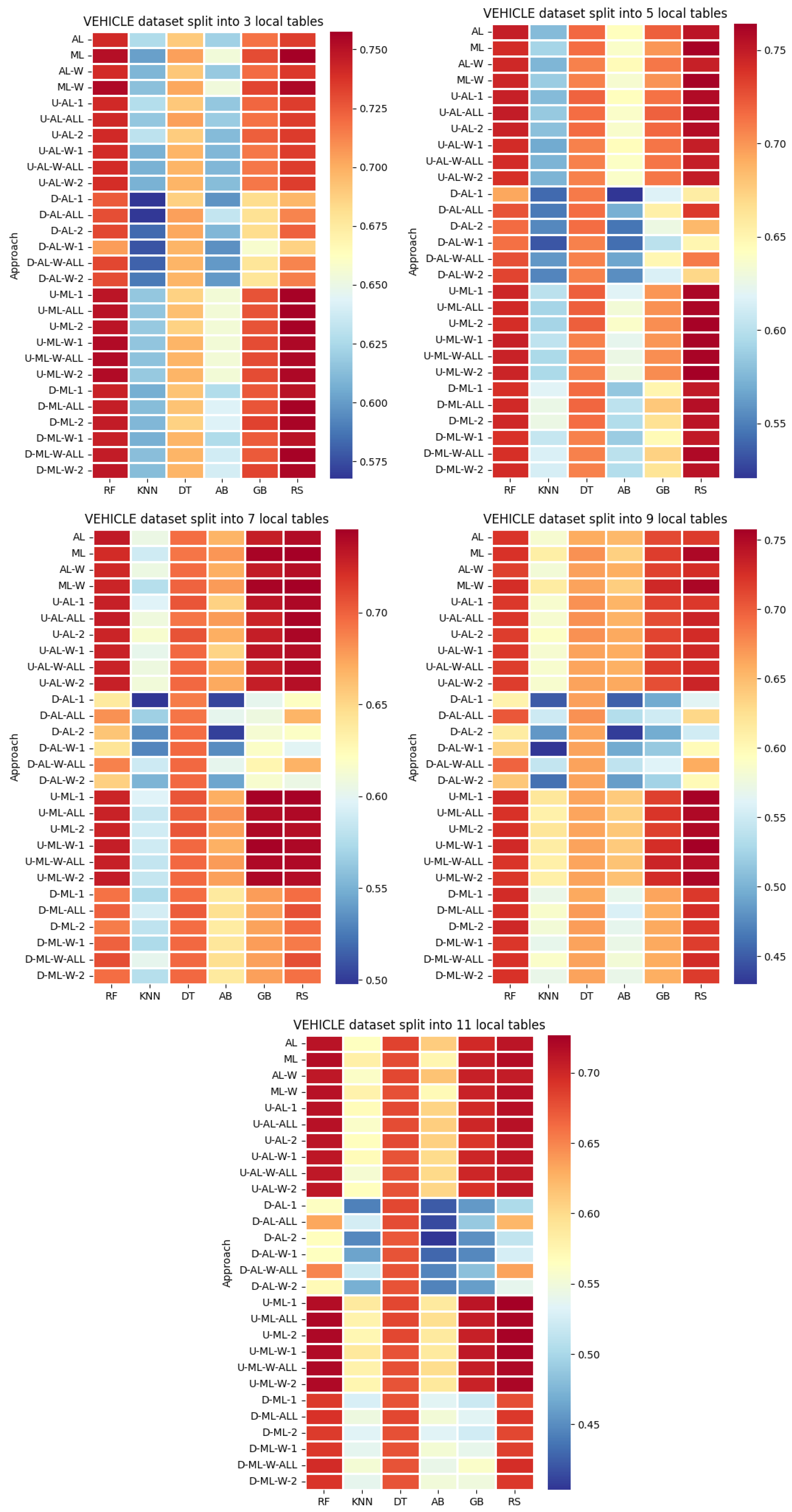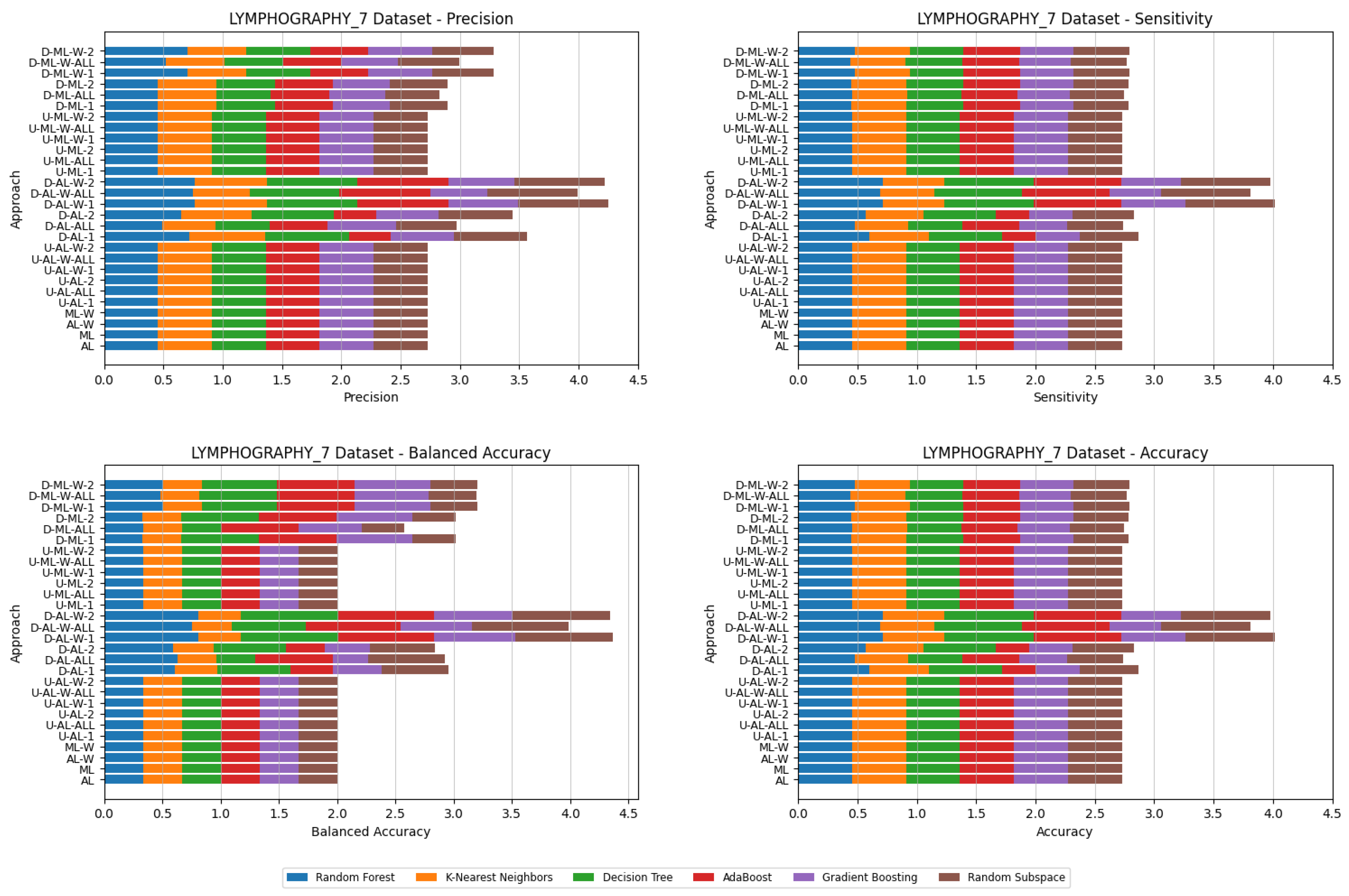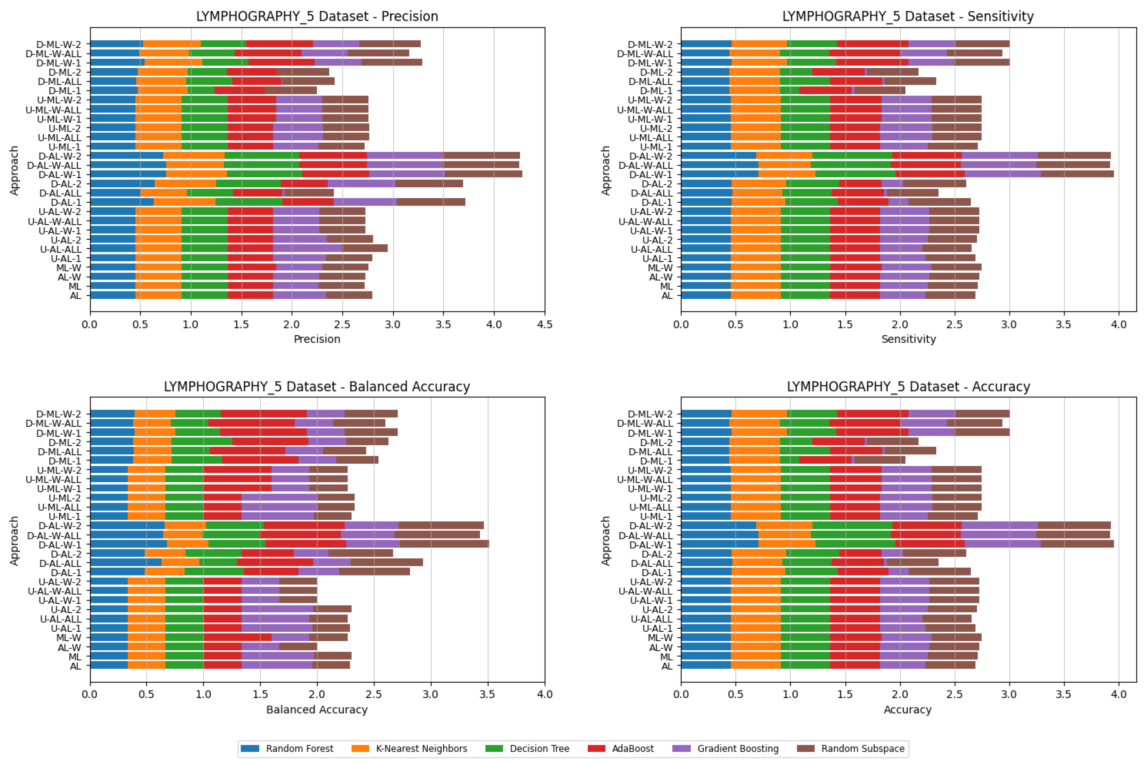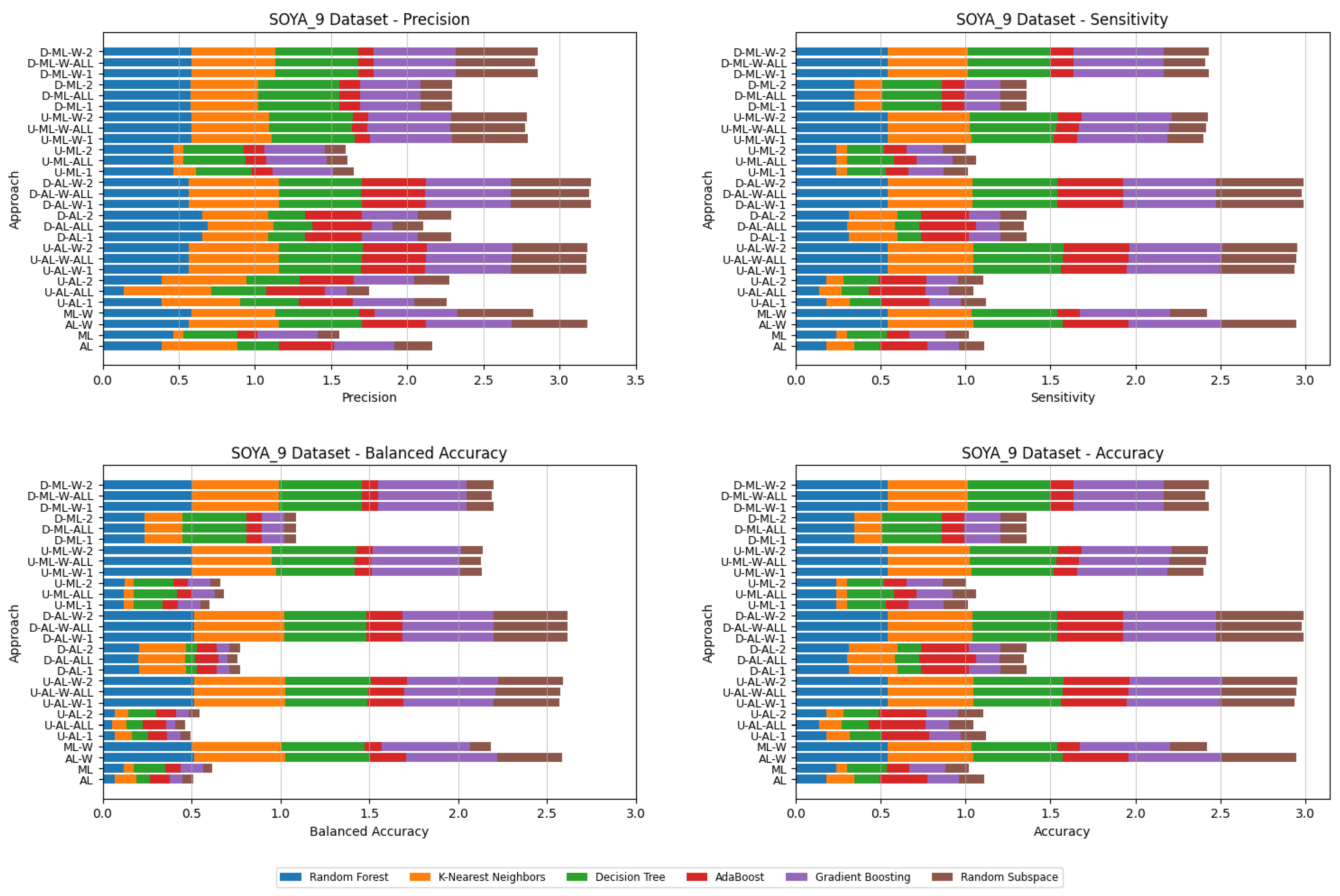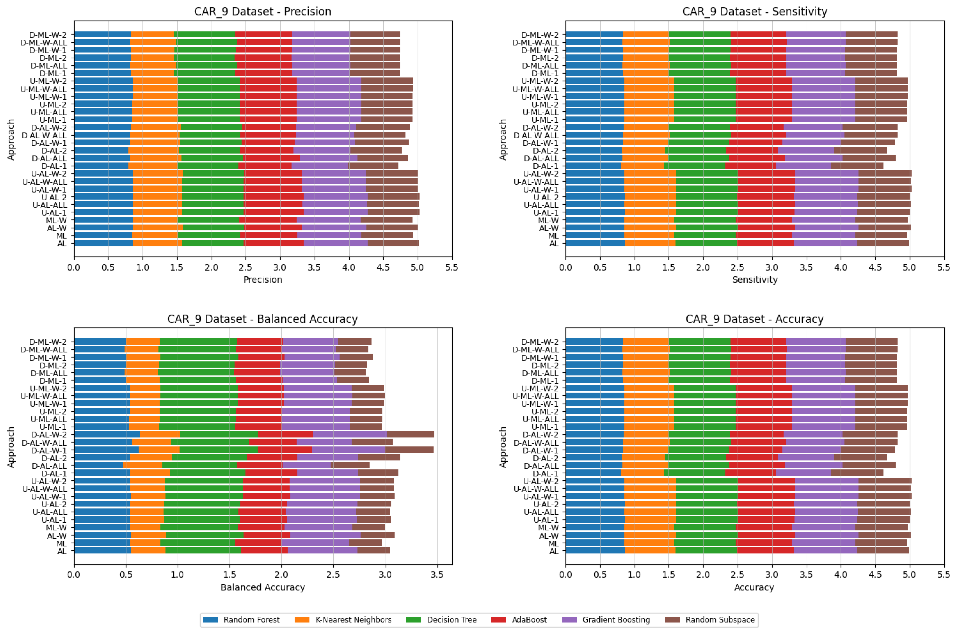 - D-AL-W-2—similar to D-AL-2 but, when summing prediction vectors, weights proportional to the quality of the local model are used.All the above approaches were also used in combination with prediction vectors from the measurement level. Thus, we obtained approaches ML, ML-W, U-ML-1, U-ML-All, U-ML-2, U-ML-W-1, U-ML-W-All, U-ML-W-2, D-ML-1, D-ML-All, D-ML-2, D-ML-W-1, D-ML-W-All, and D-ML-W-2.