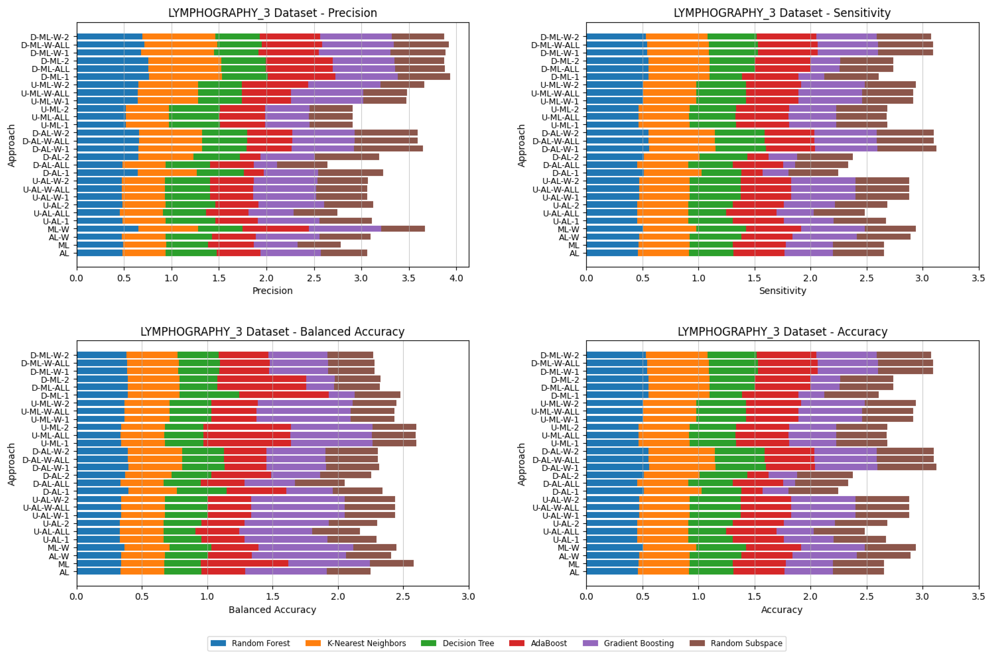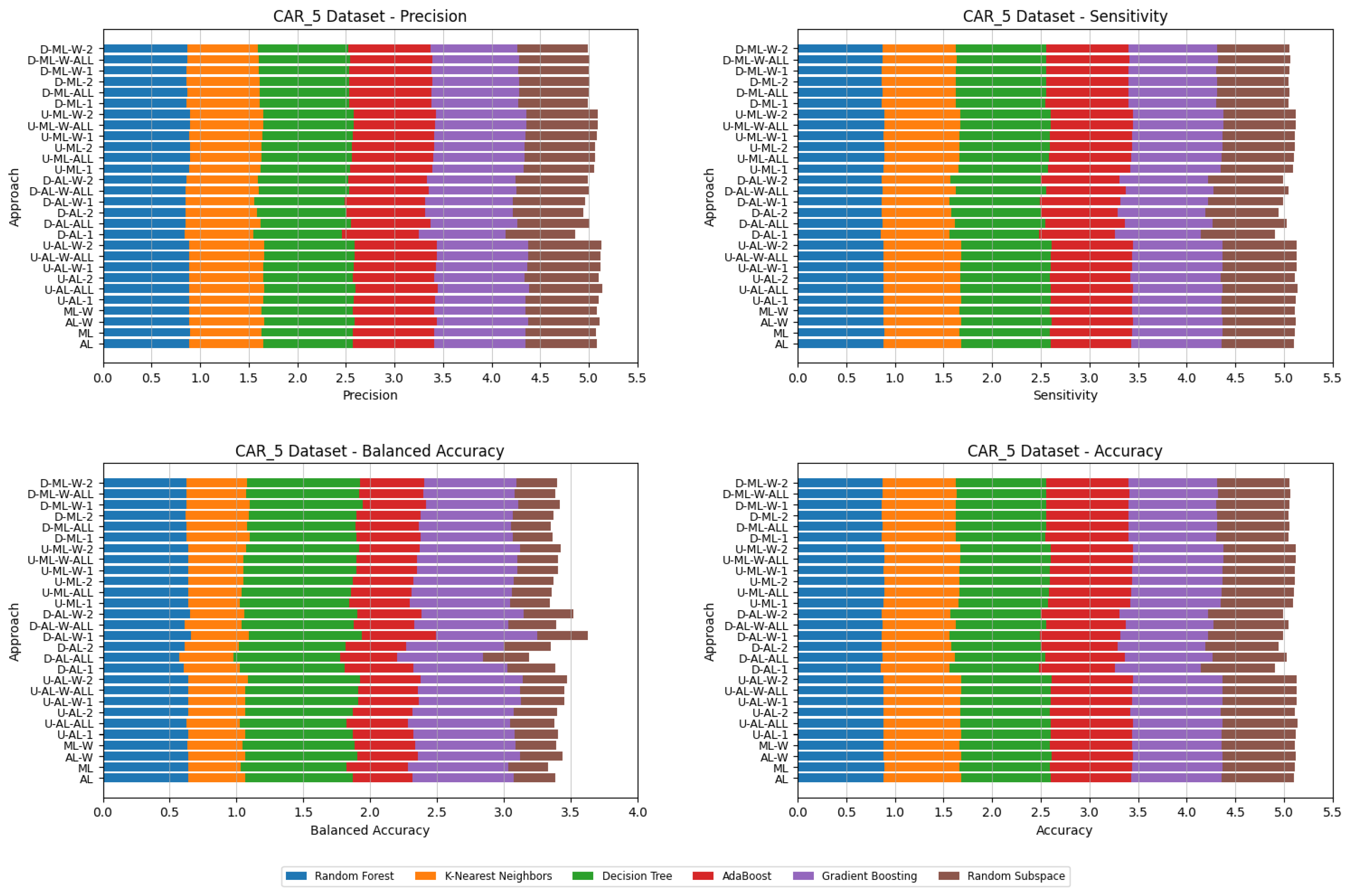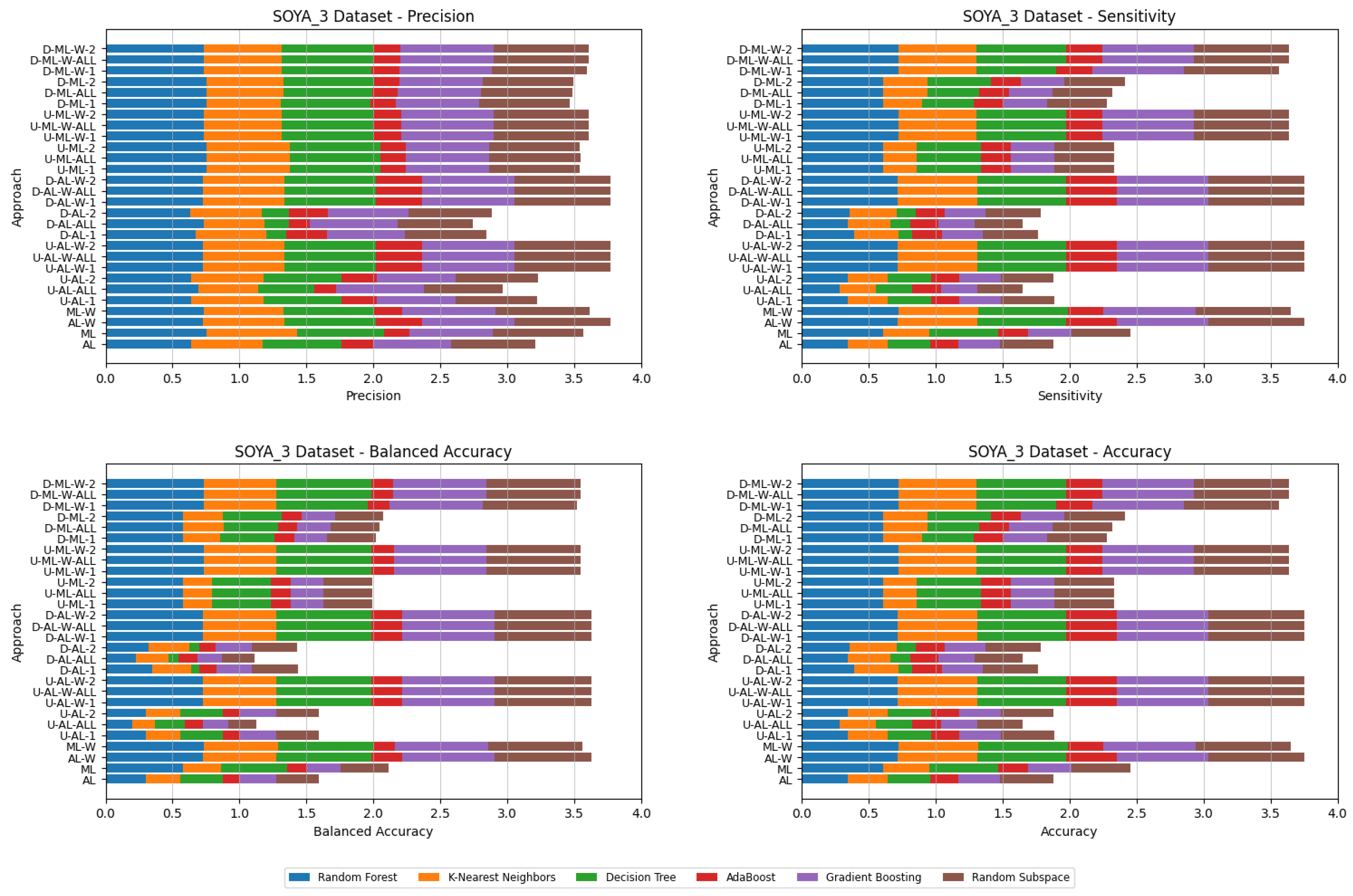 - Various numbers of estimators were tested for Gradient Boosting, Random Forest, Random Subspace, and AdaBoost, specifically 20, 50, 100, 200, and 500. The tables present the best result achieved, along with the corresponding number of estimators that produced this outcome. For each dataset, the table indicates the best result obtained. The following parameter values were tested for the k-Nearest Neighbors classifier: 1, 2, 3, 4, and 5. The Decision Tree was built with defaults in the sklearn library in Python 3.13.0. The stages of building Random Subspace model from Decision Trees are presented in Algorithm 3. From all these parameters, the best results were selected and are included in Table A1, Table A2, Table A3, Table A4, Table A5, Table A6, Table A7, Table A8, Table A9, Table A10, Table A11, Table A12, Table A13, Table A14, Table A15, Table A16, Table A17, Table A18, Table A19, Table A20 and Table A21 in Appendix A. The values presented in the tables represent the average metrics calculated across all 10 evaluations. For each dataset, the best-performing score is highlighted in blue to indicate the top result.