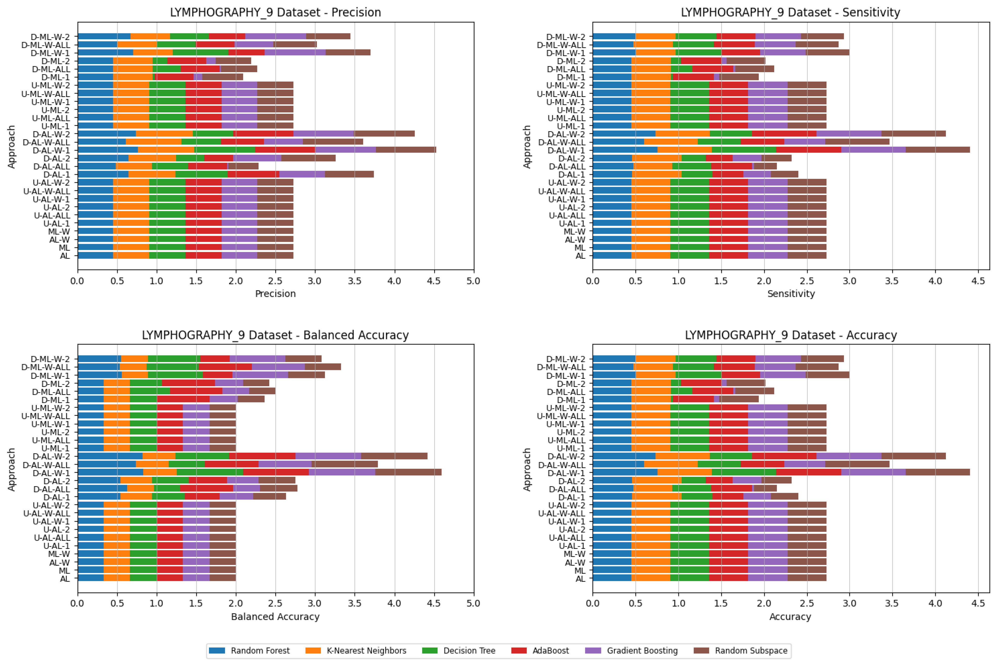 - D-AL-All—diverse coalitions are created, local classifiers generate predictions from the abstract level, and, finally, the prediction vectors from all coalitions are summed.