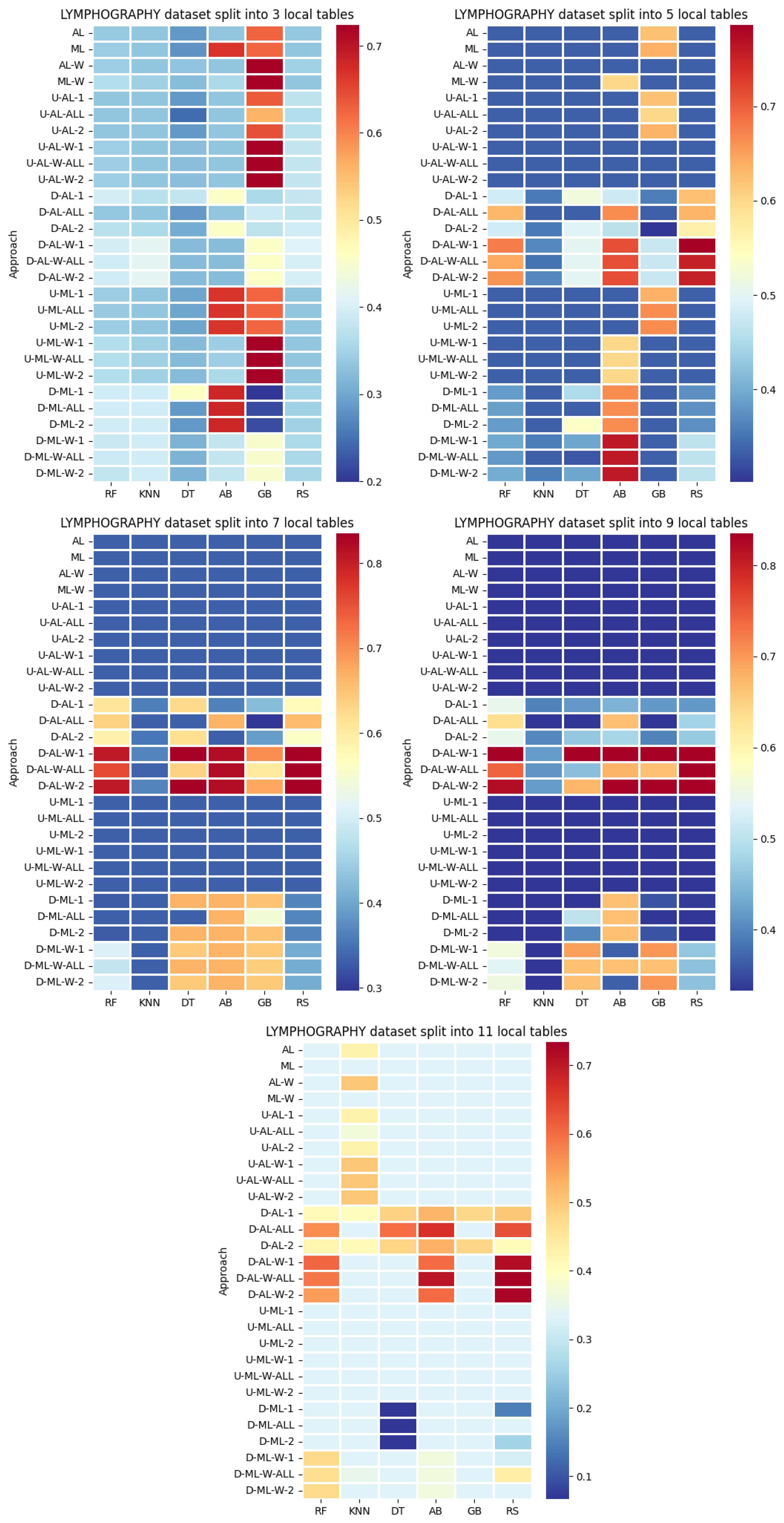 - AL-W—local classifiers generate predictions from the abstract level, and then the vectors are summed using weights proportional to the quality of the model evaluated on the validation set.