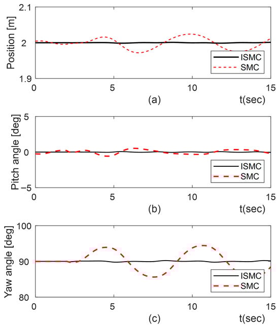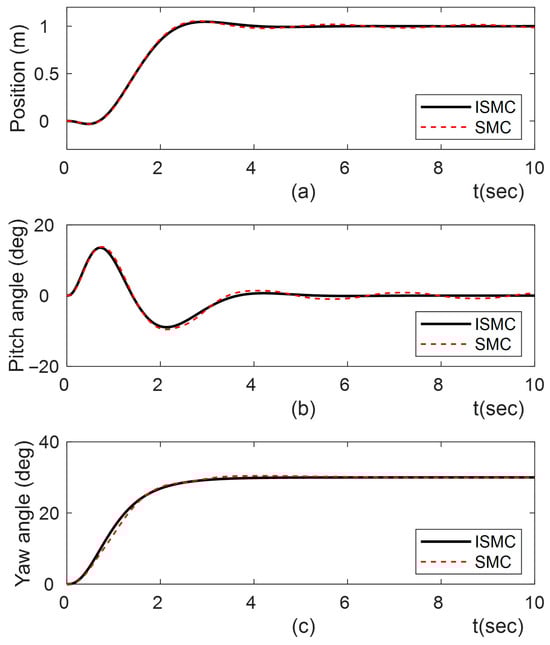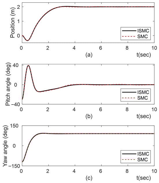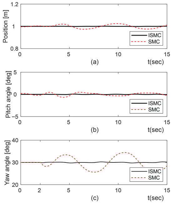 Tracking responses of ISMC and SMC for . (a) position; (b) pitch angle; (c) yaw angle.