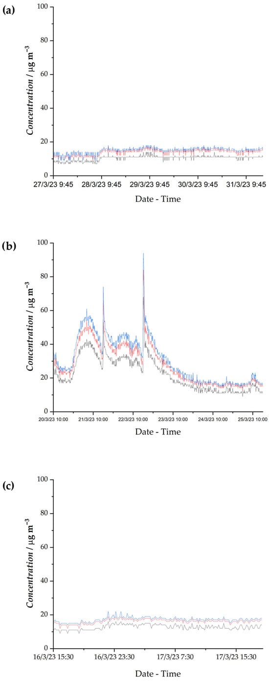 Trends of PM10 (blue line), PM2.5 (red line), and PM1 (grey line) concentrations in the sanctuary across three sampling periods: (a) 27 March 2023, 09:48–31 March 2023, 18:00; (b) 20 March 2023, 10:02–25 March 2023, 16:00; (c) 16 March 2023, 15:31–17 March 2023, 18:53.