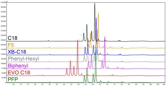 Anthocyanin separation chromatograms at the wavelength 520 nm of the extract obtained from the black currant cultivar ‘Ijunskaya Kondrashovoi’ using optimized chromatographic conditions on seven Kinetex column stationary phases—C18, F5, XB-C18, Phenyl-Hexyl, Biphenyl, EVO C18, and PFP.