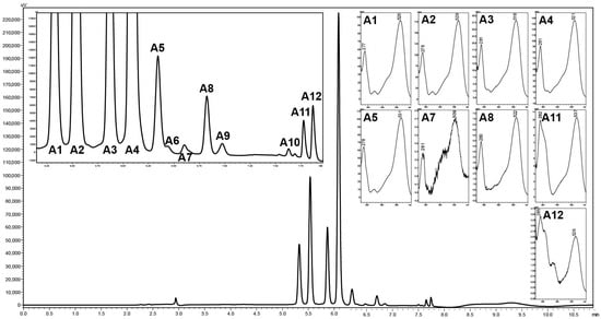 Chromatogram of anthocyanin isolation at the wavelength 520 nm from the extract of black currant cultivar ‘Ijunskaya Kondrashovoi’ using optimized chromatographic conditions on the Kinetex C18 column and UV spectra of known anthocyanins (identified by HRMS—Supplementary Materials). A1, del 3-O-glu; A2, del 3-O-rut; A3, cya 3-O-glu; A4, cya 3-O-rut; A5, pet 3-O-rut; A6, unknown anthocyanin–UA6; A7, pel 3-O-rut; A8, peo 3-O-rut; A9, unknown anthocyanin–UA9; A10, unknown anthocyanin–UA10; A11, del 3-O-(6″); A12, cya 3-O-(6″).