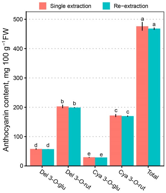 Differences in the anthocyanin content in the extract of black currants depending on protocol—single extraction vs. re-extraction. Letters denote statistically homogenous groups (p > 0.05).