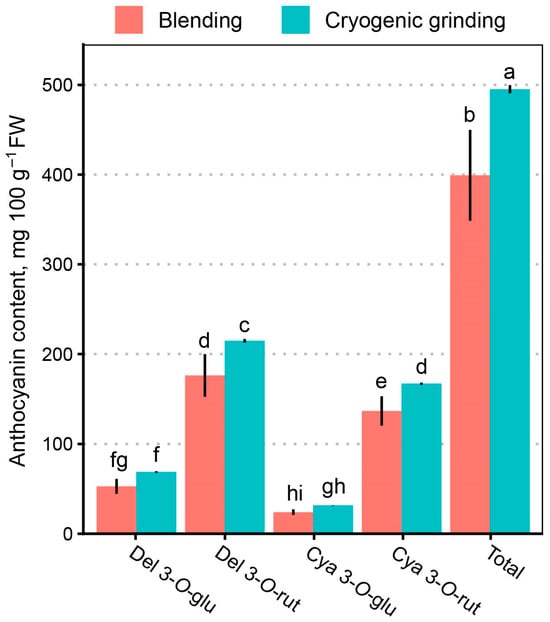 Effect of pre-treatment—(blending vs. cryogenic grinding prior to blending)—on anthocyanin content in the extract of black currants. Letters denote statistically homogenous groups (p > 0.05).