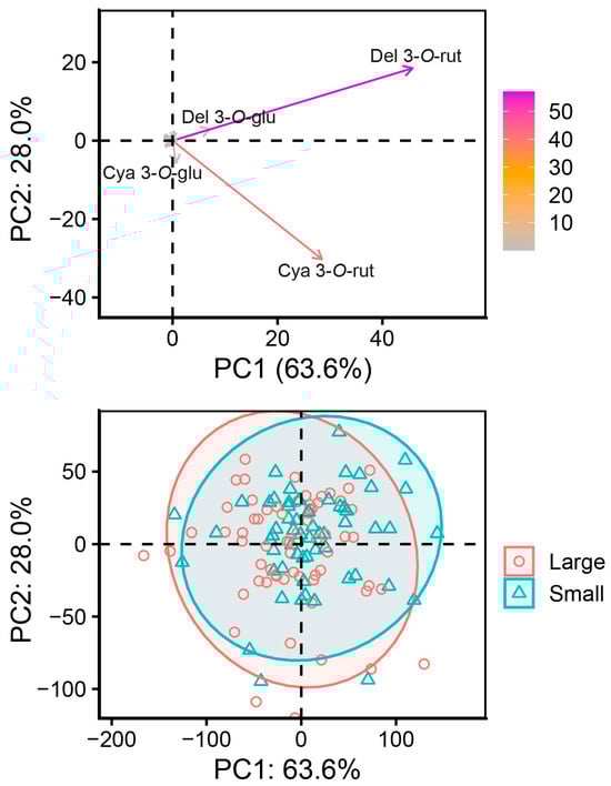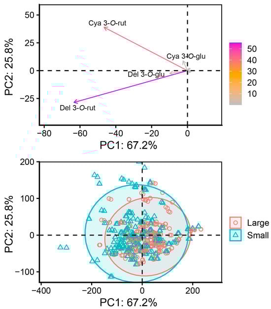 Principal component analysis (PCA) identified principal components (PC) PC1 and PC2, which explain 67.2% and 15.8% of total variance for a total of 93.0% explained variance. The main contributors to PC scores were del 3-O-rut and cya 3-O-rut. Of these, del 3-O-rut was negatively associated with PC1 (−0.80) and PC2 (−0.58), while cya 3-O-rut was negatively associated with PC1 (−0.59) and positively associated with PC2 (0.79). While the individual datapoint scores overlapped significantly, the ellipse of the small currant berry datapoints is bigger (Figure 8). While non-hierarchal cluster analysis was performed and cluster analysis identified two groups of clusters, the between-cluster sum of squares was 39.9% of total sum of squares, and the proportion and distribution of small- and large-berry datapoints was similar between the two clusters, with significant overlap of clusters.
