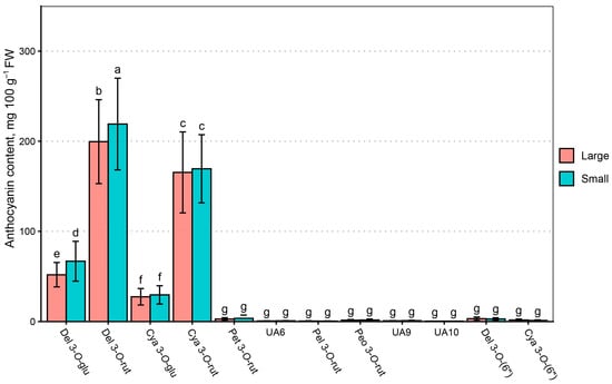 Anthocyanin contents were significantly affected by the genotype mean berry size, but genotypes with larger berries had higher anthocyanin contents. MANOVA identified statistically significant differences between del 3-O-glu (p < 0.001), del 3-O-rut (p < 0.05), and total anthocyanin content (p < 0.01), while main anthocyanin sum was similar between groups (p > 0.5). Significant differences were identified between UA6 (p < 0.001), UA9 (p < 0.001), and cya 3-O-(6″) (p < 0.01) contents. However, the post hoc test only identified statistically significant differences between individual anthocyanin, del 3-O-glu, and del 3-O-rut content (Figure 10).