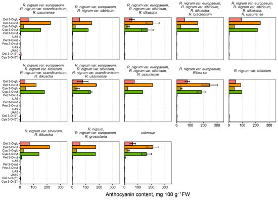 The analyzed genotypes can be grouped to some degree based on their ancestry (species and varieties used in breeding). While “black currant” generally refers to R. nigrum, several varieties and other species have been used in plant breeding, as they are in a number of fruit crops. These included R. nigrum varieties eurapeum, sibiricum, scandinavicum, and R. ussuriense (synonym of R. procumbens, or Korean currant), R. dikuscha (Dikusha currant), R. bracteosum (stink currant), and R. grossularia (synonym of R. uva-crispa, or gooseberry). The mean anthocyanin contents are visualized in Figure 12. The make-up of anthocyanins is quite similar between the different known ancestries, but detailed histories are not available for any of the tested genotypes.
