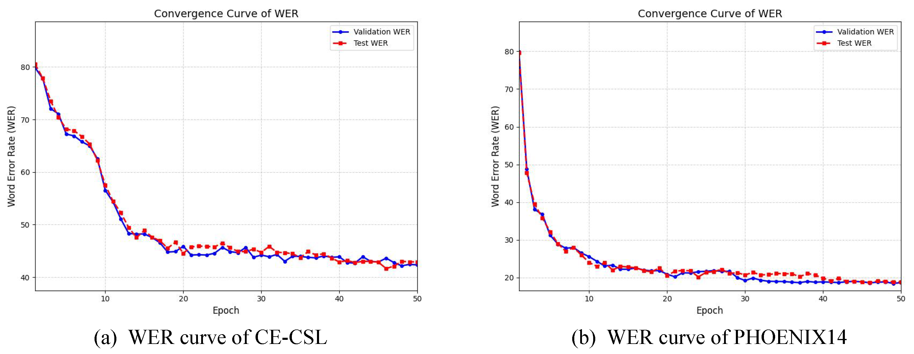 - Zhu, Q.; Li, J.; Yuan, F.; Gan, Q. Continuous sign language recognition based on motor attention mechanism and frame-level self-distillation. Mach. Vis. Appl. 2025, 36, 7. [Google Scholar] [CrossRef]