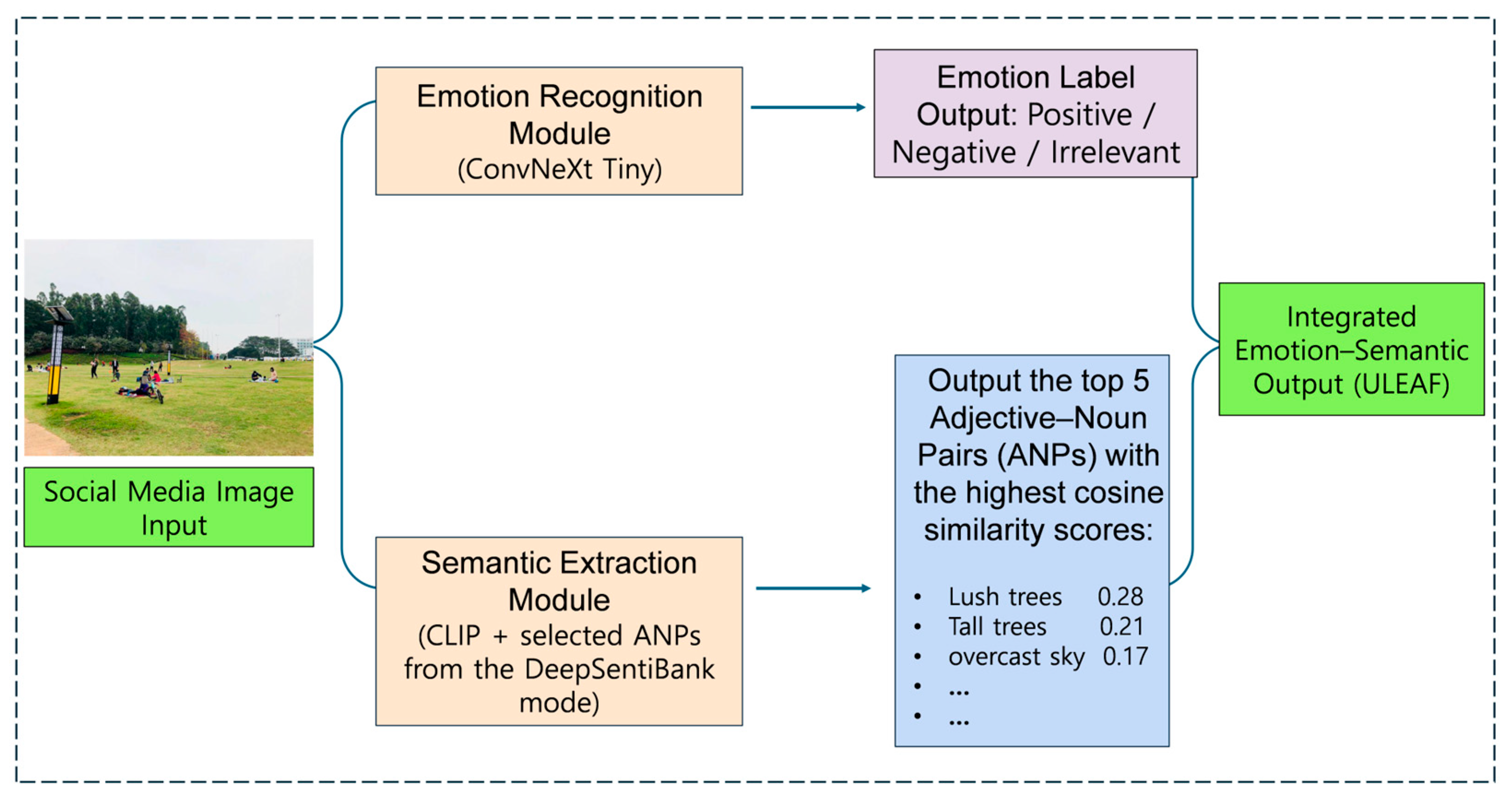 Chicago/Turabian StyleZhang, Yujie, Ganyang Yu, Lei Zhang, Taeyeol Jung, and Hongbin Xu. 2026. "A Deep Learning Framework for Emotion Recognition and Semantic Interpretation of Social Media Images in Urban Parks: The ULEAF Approach" Applied Sciences 16, no. 1: 127. https://doi.org/10.3390/app16010127