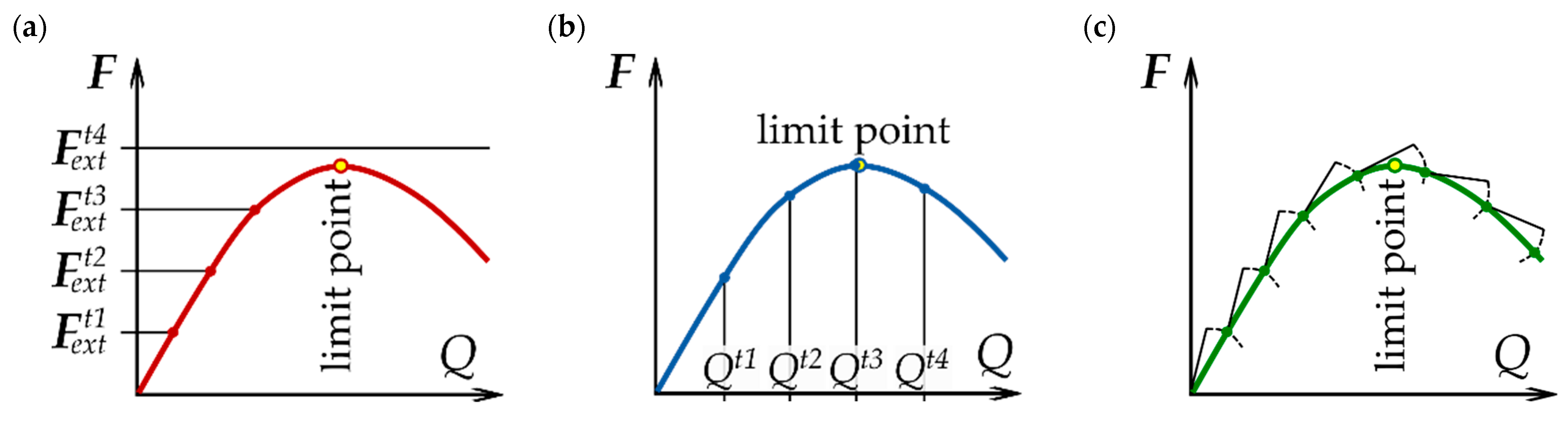 To solve the system of Equation (1), incremental–iterative methods are most commonly used, based, for example, on the Newton–Raphson algorithm [25]. In iterative methods, successive points along the equilibrium path are determined step by step. In each step, a series of iterations is performed to achieve equilibrium, such that by the end of the step, the solution satisfies the prescribed accuracy. Depending on the type of step control applied, the following approaches can be distinguished: