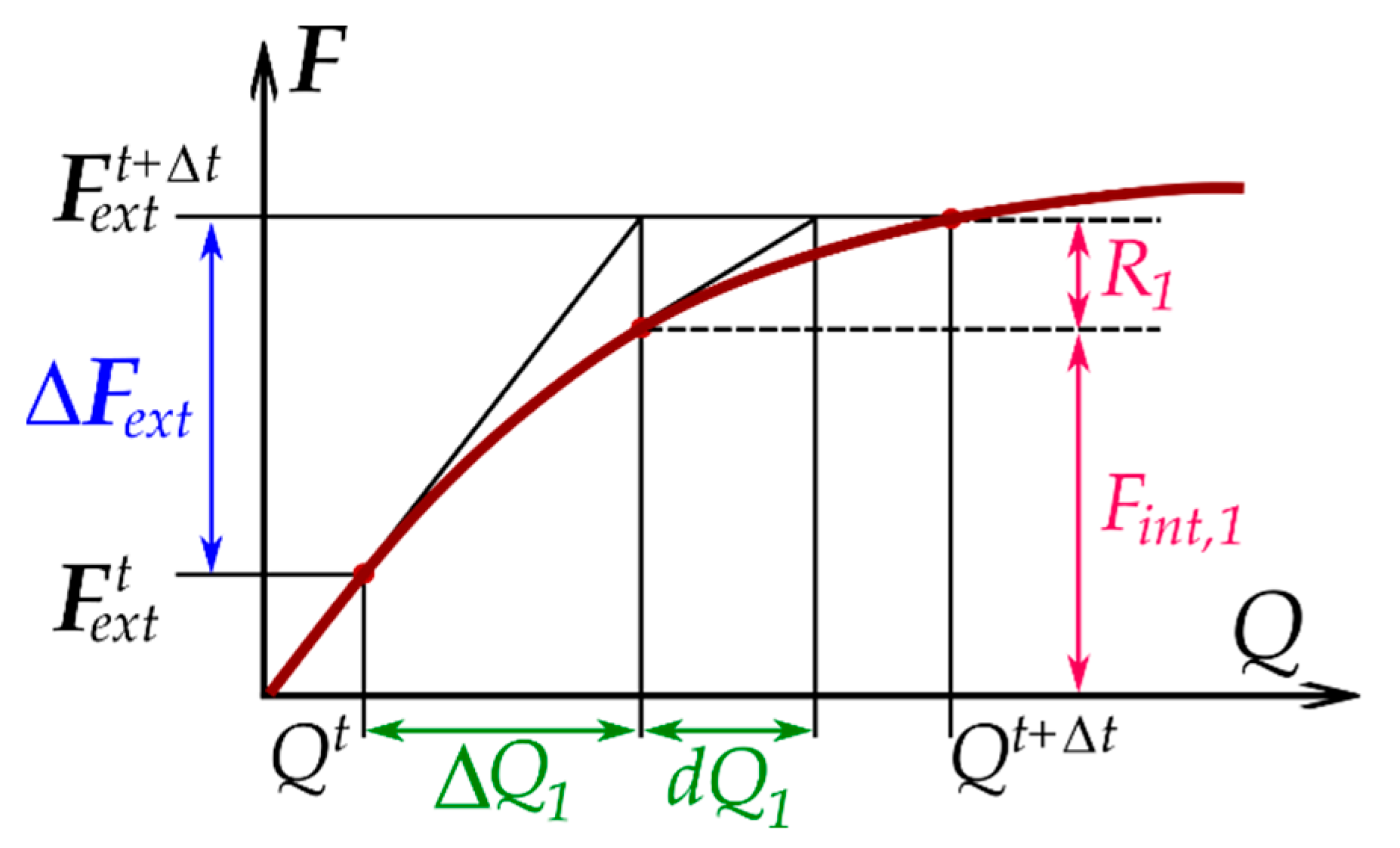 In the case of nonlinear analysis, the relationship between the internal force vector F i n t t and the displacement vector Q at the system level is nonlinear. Moreover, the vector F i n t t also depends on the load history. Therefore, in order to determine the equilibrium state of the system, it is necessary to discretize not only the space using finite elements but also the time t.