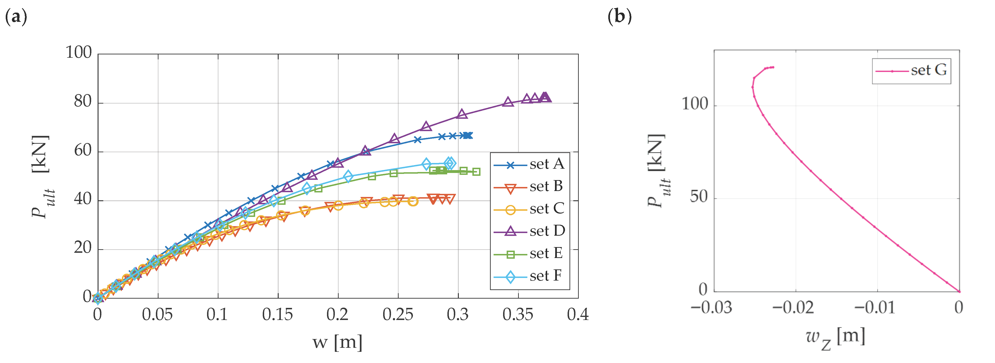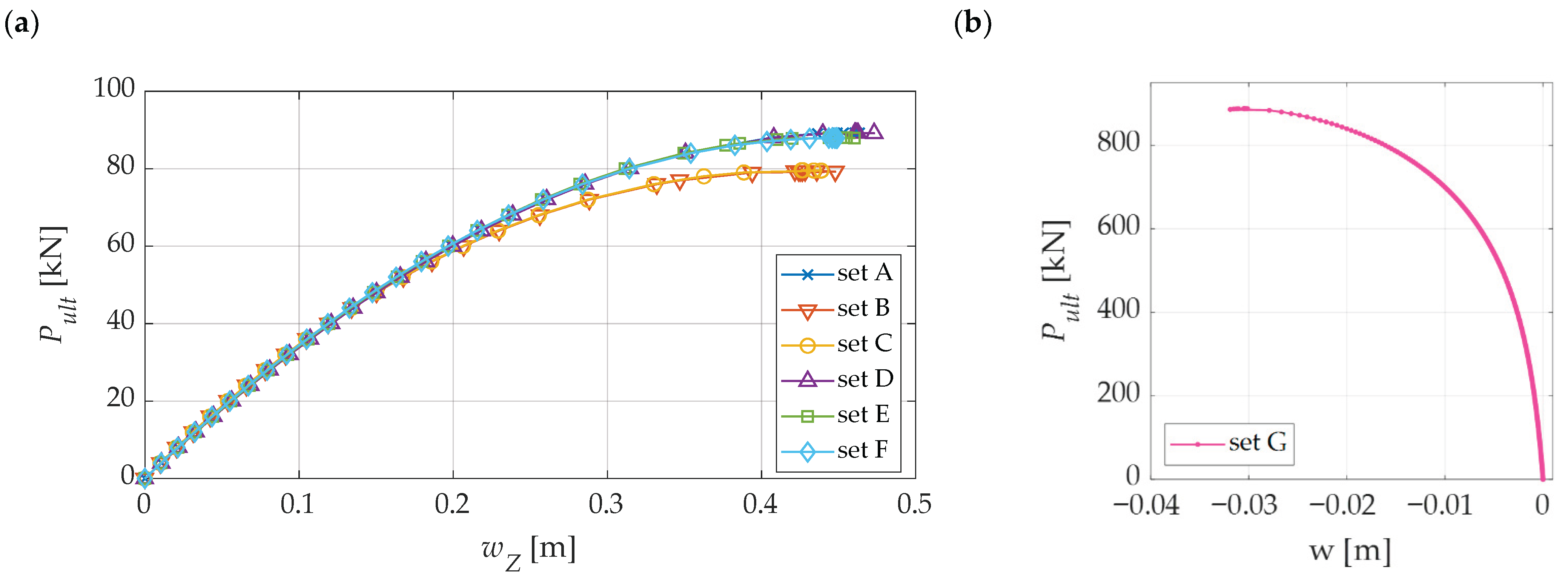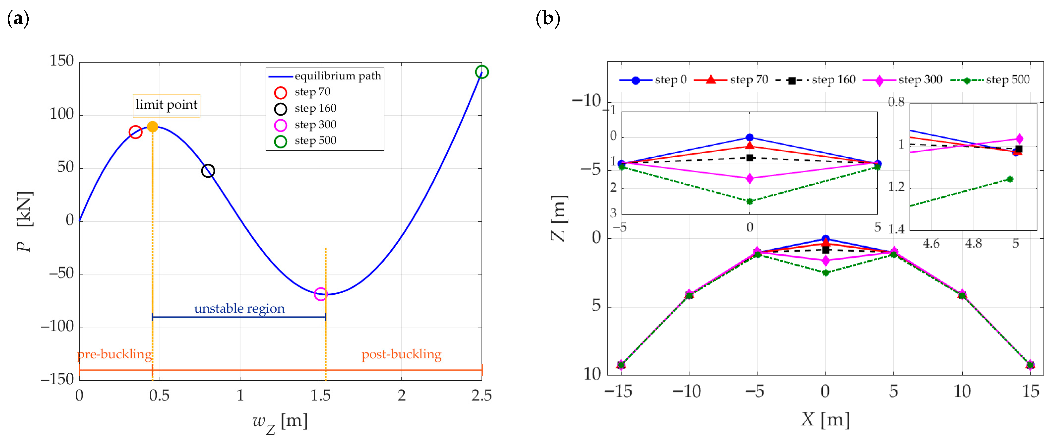 For each case, the equilibrium paths were determined using the Newton–Raphson algorithm under both load control and displacement control. To accurately identify the position of the limit point along the equilibrium path, an adaptive step-length strategy was employed.