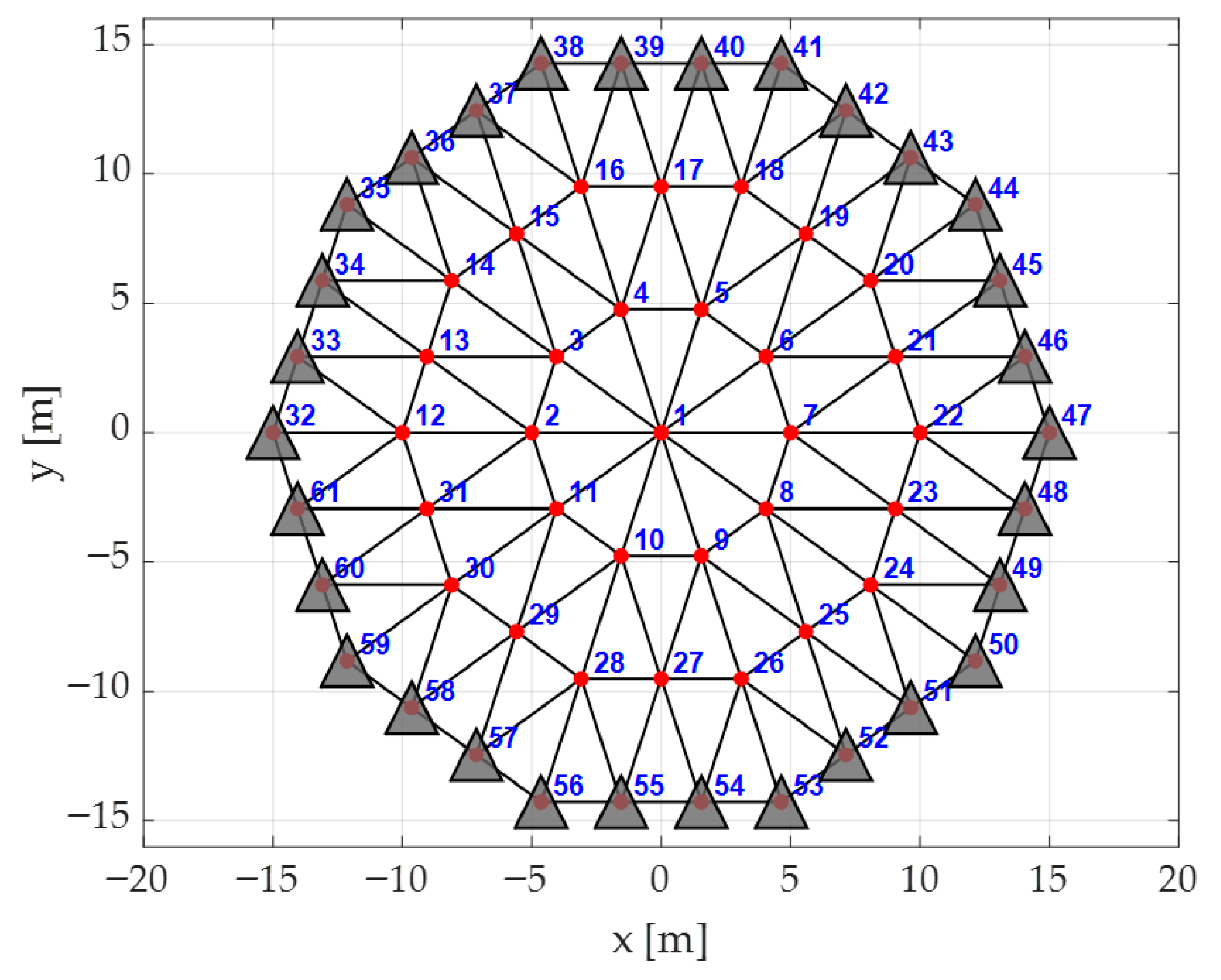 Figure 11. Diagram of the nodes of the spatial truss, in the XY projection for Case 3.