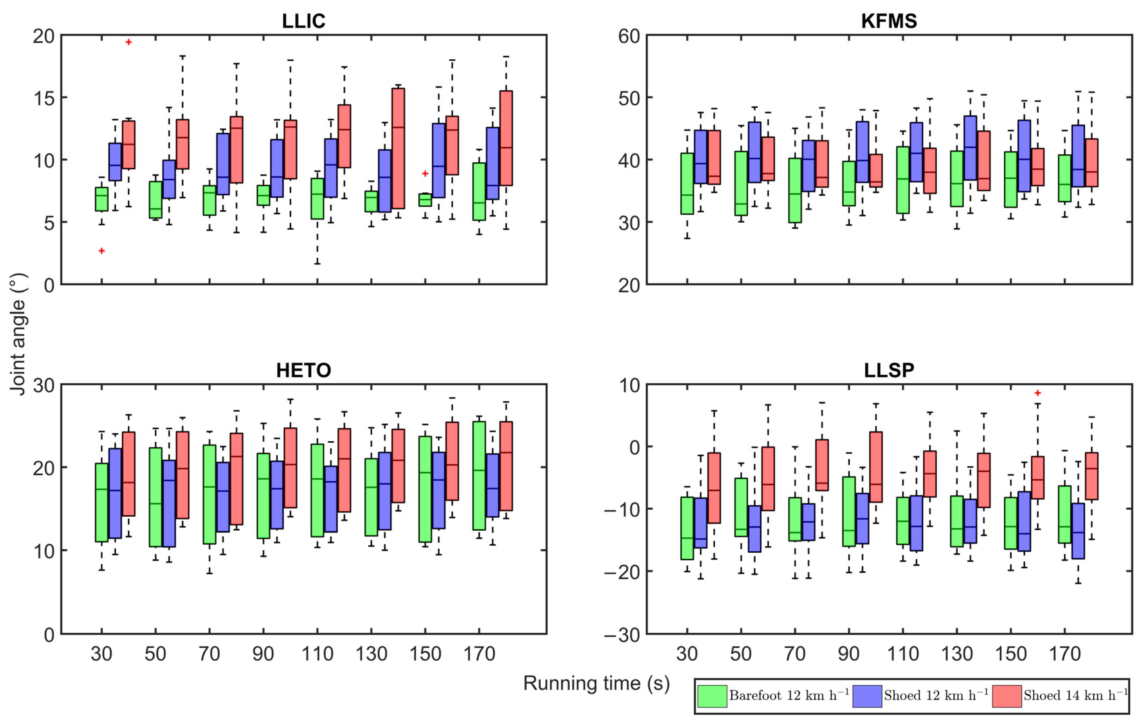 - Hall, J.P.; Barton, C.; Jones, P.R.; Morrissey, D. The biomechanical differences between barefoot and shod distance running: A systematic review and preliminary meta-analysis. Sports Med. 2013, 43, 1335–1353. [Google Scholar] [CrossRef]