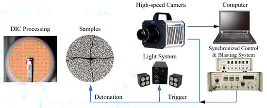 As an optical measurement method for accurate measurement of full-field strain, the digital image correlation method has been maturely applied to the experimental study of statics and impact dynamics [23]. Combined with high-speed photography technology and the digital image correlation method, a set of ultra-high-speed digital image correlation experimental system suitable for the study of ultra-dynamic problems, such as blasting, is established, as shown in Figure 1. The main components of the experimental system include a high-speed camera, lighting system, synchronous control system and detonation system, explosive loading device, and digital image correlation calculation software [24,25]. The introduction of related components is as follows: