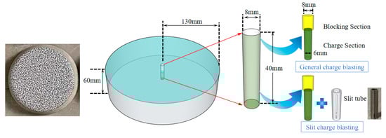 This hole comprised a charging section and a plugging section: the charging section measured 6 mm in diameter and 30 mm in length, while the plugging section measured 8 mm in diameter and 10 mm in length. For the slit charge blasting tests, a slit tube was installed in the charging section. The tube had an external diameter of 8 mm, an internal diameter of 6 mm, and a length of 30 mm. The slit measured 26 mm in length and 1 mm in width, positioned centrally within the slit tube, as illustrated in Figure 2.