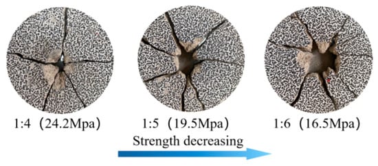 Comparing the crushing area of the specimen with the weakening of the rock strength, the area of the central crushing area gradually increases; the fracture zone of the specimen was compared. When the rock strength was 24.2 MPa, there were five main cracks in the specimen. When the rock strength is 19.5 MPa, seven main cracks are generated in the specimen.