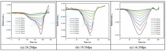 In Figure 5a, compressive strain begins to appear at t = 60 μs. At t = 185 μs, the strain reaches its peak, after which radial strain begins to rebound at a faster rate than during the compression phase. In Figure 5b, compressive strain begins at t = 50 μs. The strain peaks at t = 115 μs, and the first monitoring point fails 5 μs later. The rebound rate of radial strain is faster than that during the compression phase. Near t = 150 μs, radial strain transitions from compressive to tensile. In Figure 5c, compressive strain begins to appear at t = 60 μs. At t = 185 μs, the strain reaches its peak, after which radial strain begins to rebound. The rebound rate is faster than that of the compression phase. For lower-strength rock, the strain rate was lower, but the peak radial strain was higher (9985 με). Conversely, higher-strength rock exhibited a higher strain rate but a lower peak radial strain (5102 με).