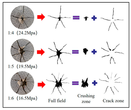 The degree of damage in rock masses is one of the key ways they respond to explosive loads. Combining fractal theory, we analyze the crack distribution patterns in the crushing zone and crack zone during blasting of rocks with varying strengths. To accurately assess rock damage, the test specimens were divided into zones. Due to specimen size constraints, the rock mass was divided into two zones: the crushing zone and the crack zone. The outer contours of the crushing and fracture zones were extracted and subjected to binarization processing. The damage in each zone was then studied separately, as illustrated in Figure 7. The region exhibiting pervasive fragmentation is defined as the crushing zone, whereas the remaining area containing only fractures is termed the crack zone.