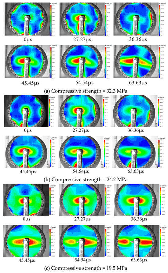 Comparing the principal strain distributions of the two specimens, as shown in Figure 11, the specimen with lower strength exhibits larger peak strains. During crack propagation, the boundaries of the strain contour map in the crack tip region are more distinct. In contrast, the specimen with higher strength shows smaller peak strains, and the boundaries of the strain contour map around the crack propagation path appear relatively blurred. Comparing high-speed camera images with the final failure modes of the specimens reveals that cracks initially propagate outward from the energy-focusing direction of the slit tube. After propagating a certain distance, a pair of cracks appears symmetrically perpendicular to the slit direction, termed secondary cracks. In higher-strength specimens, secondary cracks initiated earlier.